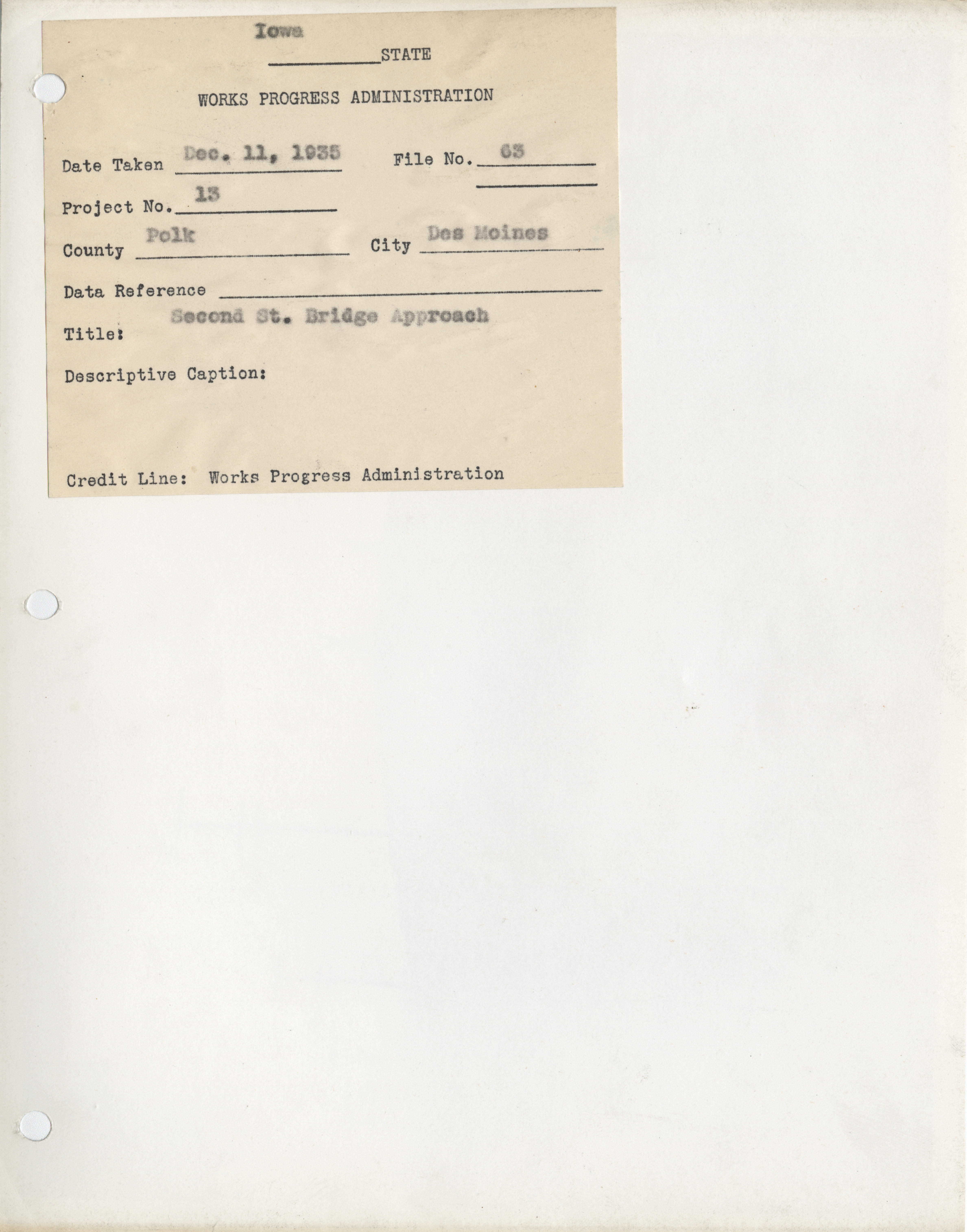 - "Photograph of the Second St. bridge approach in Des Moines", Work Projects Administration (Iowa) Photographs, Iowa State University Library Digital Collections