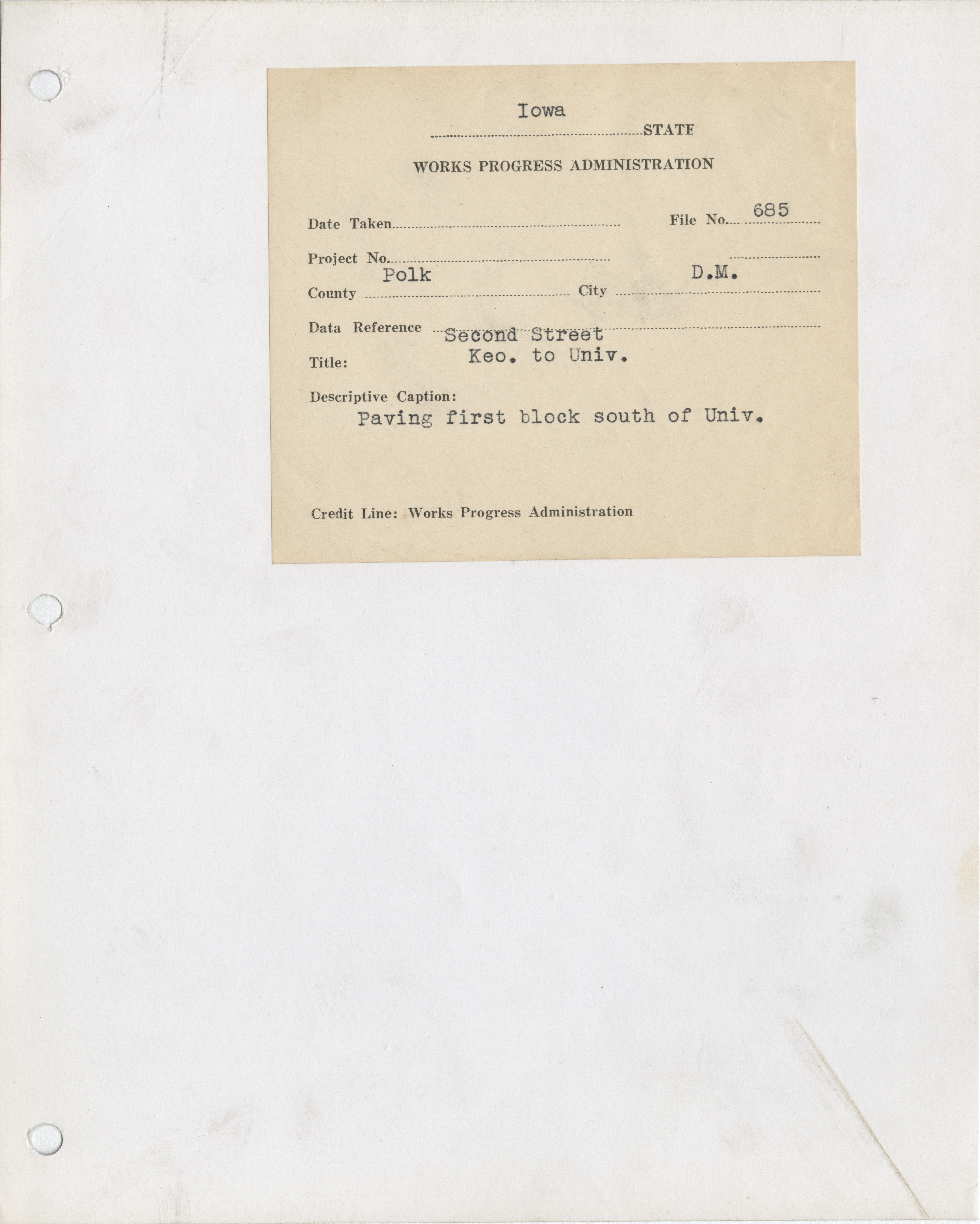 - "Photograph of people paving the first block of Second Street south of University in Des Moines", Work Projects Administration (Iowa) Photographs, Iowa State University Library Digital Collections
