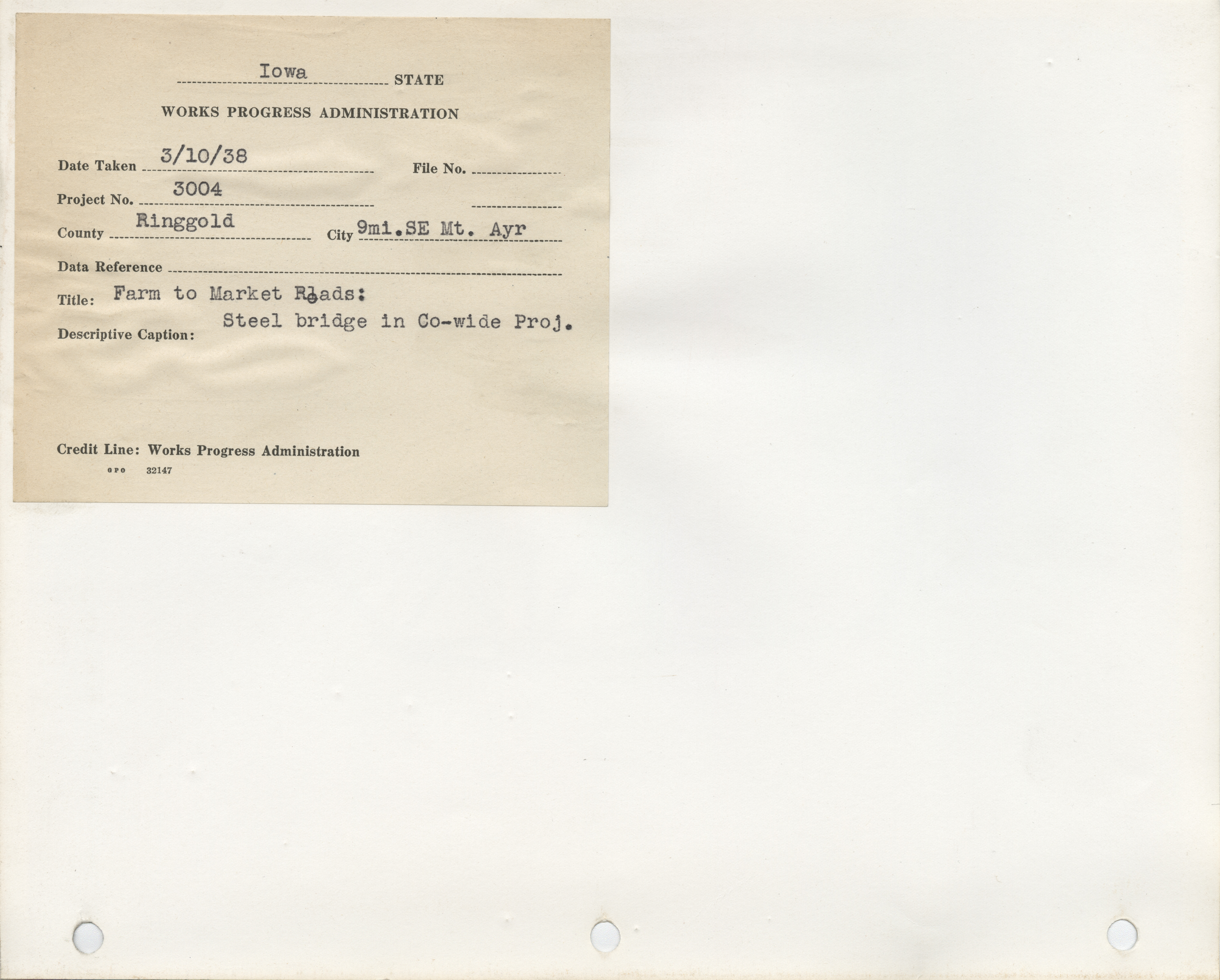 - "Photograph of a steel bridge on a farm to market road in Ringgold County", Work Projects Administration (Iowa) Photographs, Iowa State University Library Digital Collections
