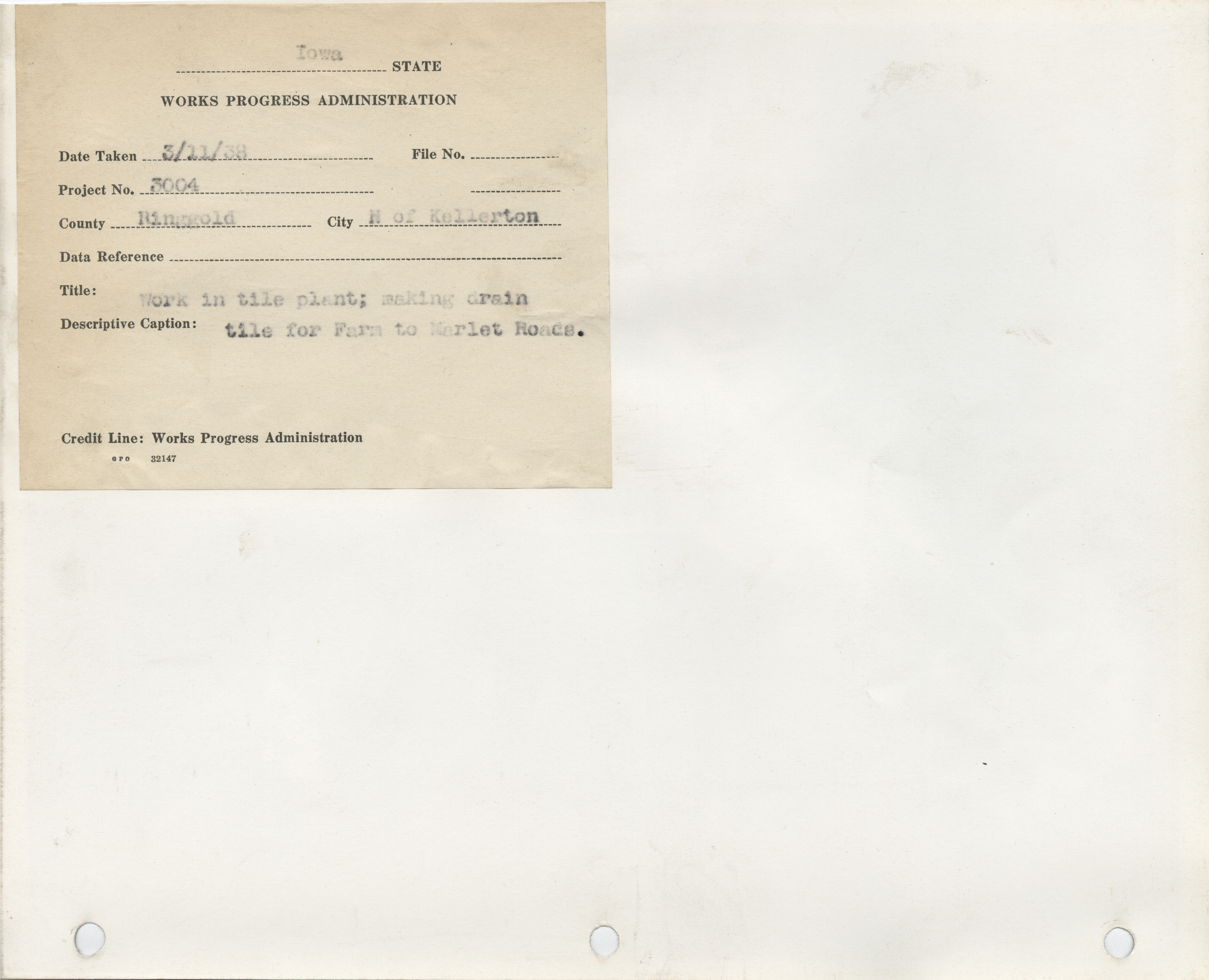 - "Photograph of people making drain tiles in Ringgold County", Work Projects Administration (Iowa) Photographs, Iowa State University Library Digital Collections