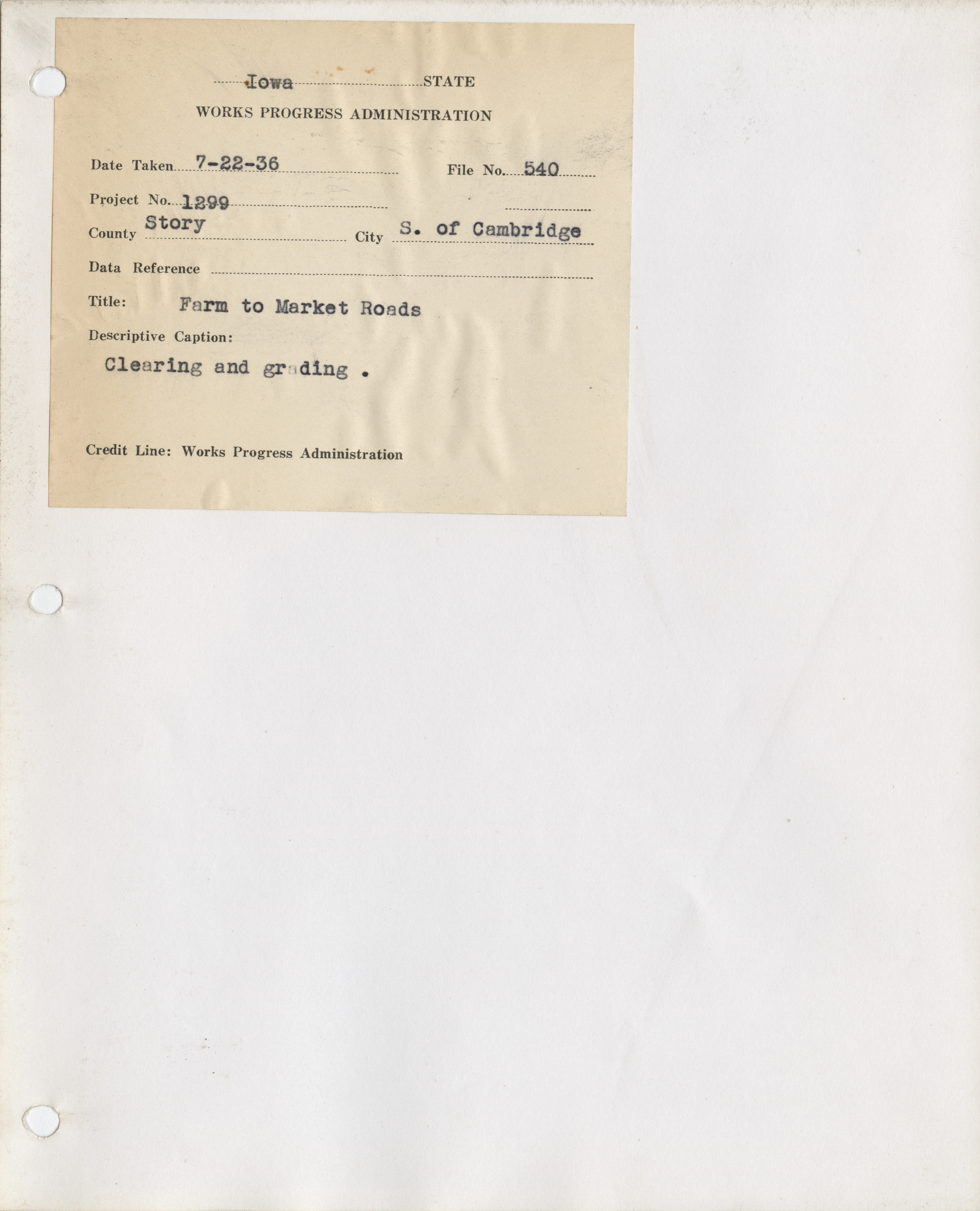 - "Photograph of clearing and grading a farm to market road in Story County", Work Projects Administration (Iowa) Photographs, Iowa State University Library Digital Collections