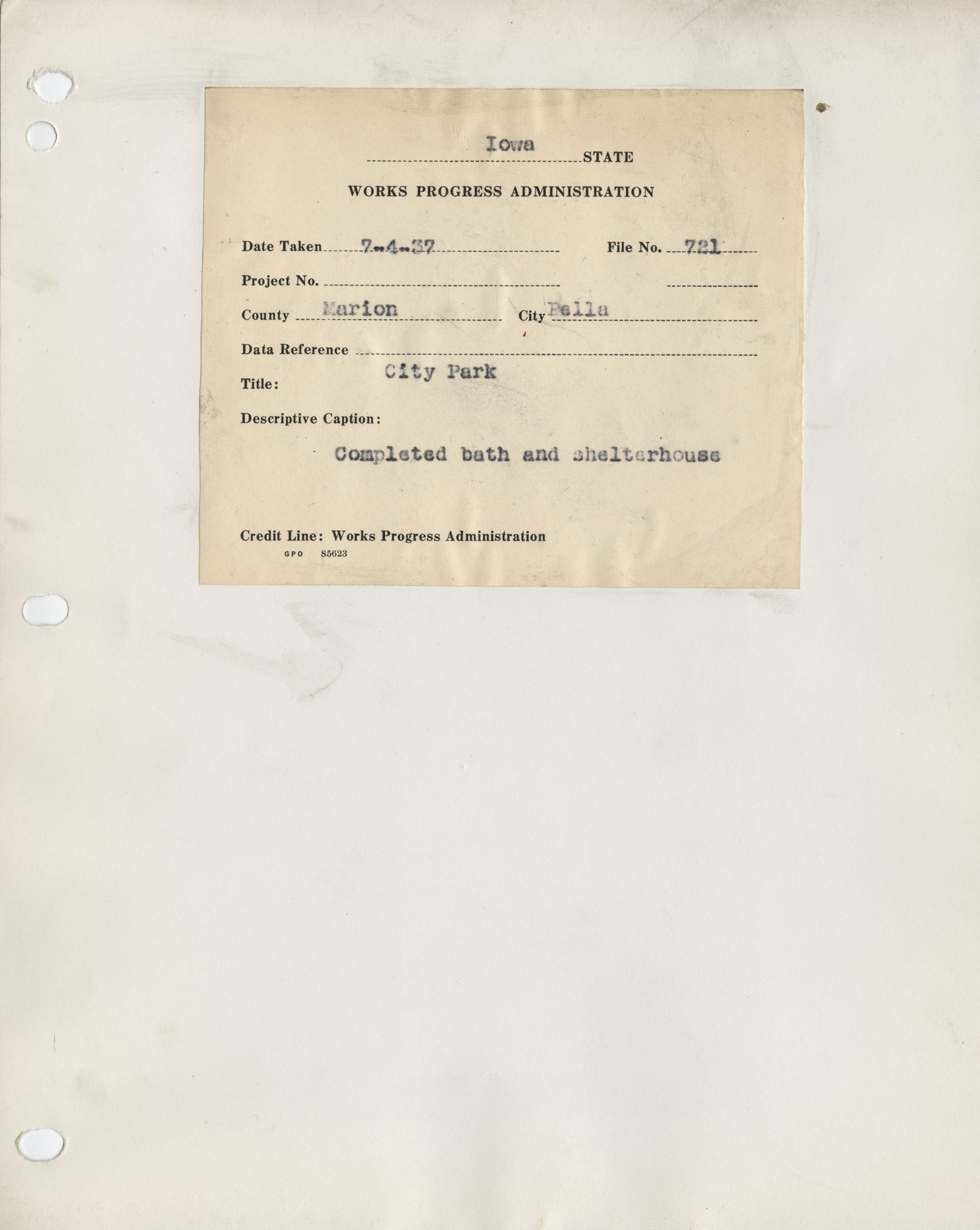 - "Photograph of two people standing outside a shelter house at a city park in Pella", Work Projects Administration (Iowa) Photographs, Iowa State University Library Digital Collections