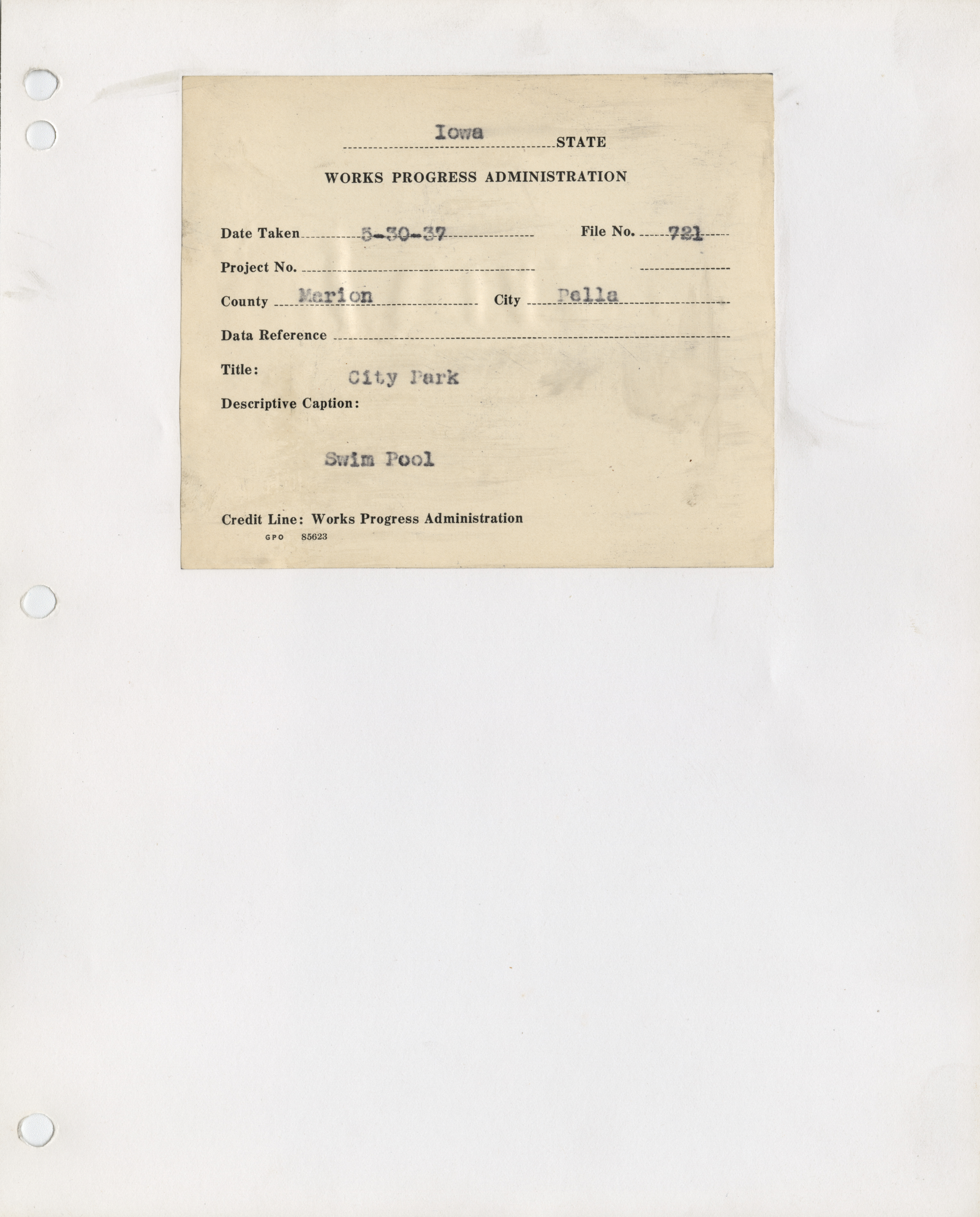 - "Photograph of the construction of a swimming pool at a city park in Pella", Work Projects Administration (Iowa) Photographs, Iowa State University Library Digital Collections