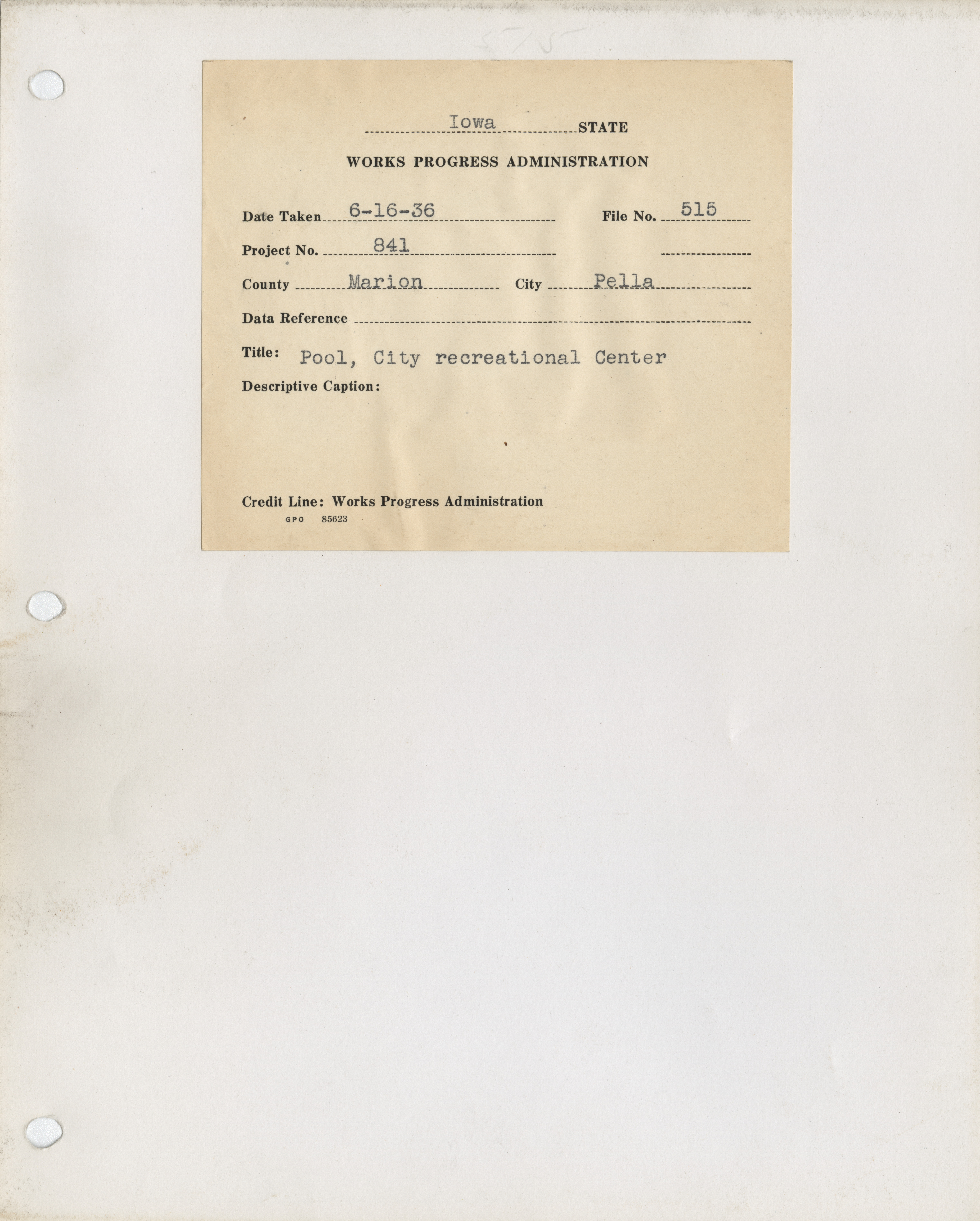 - "Photograph of the construction of a swimming pool at the city recreational center in Pella", Work Projects Administration (Iowa) Photographs, Iowa State University Library Digital Collections