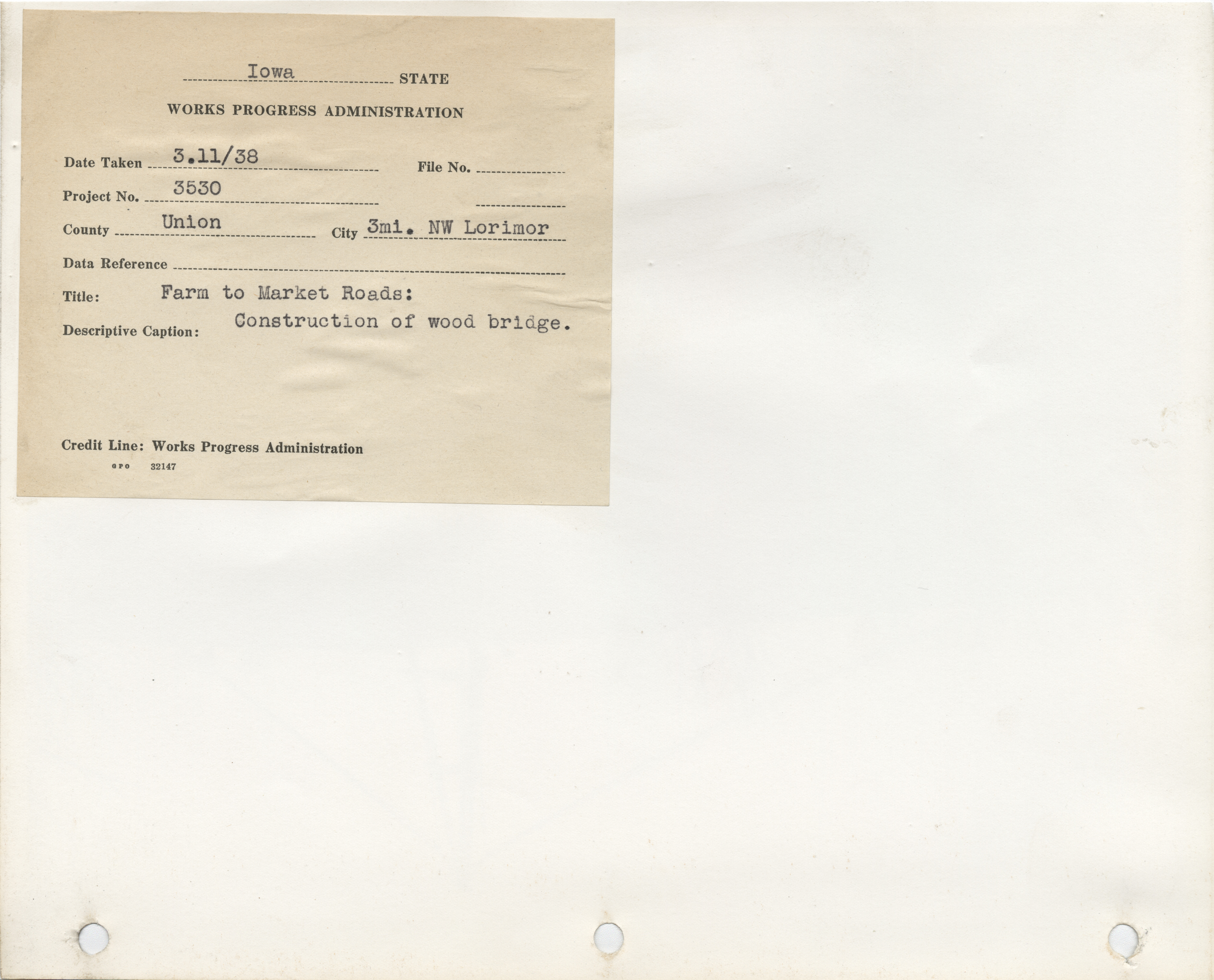 - "Photograph of the construction of a wood bridge on a farm to market road in Union County", Work Projects Administration (Iowa) Photographs, Iowa State University Library Digital Collections