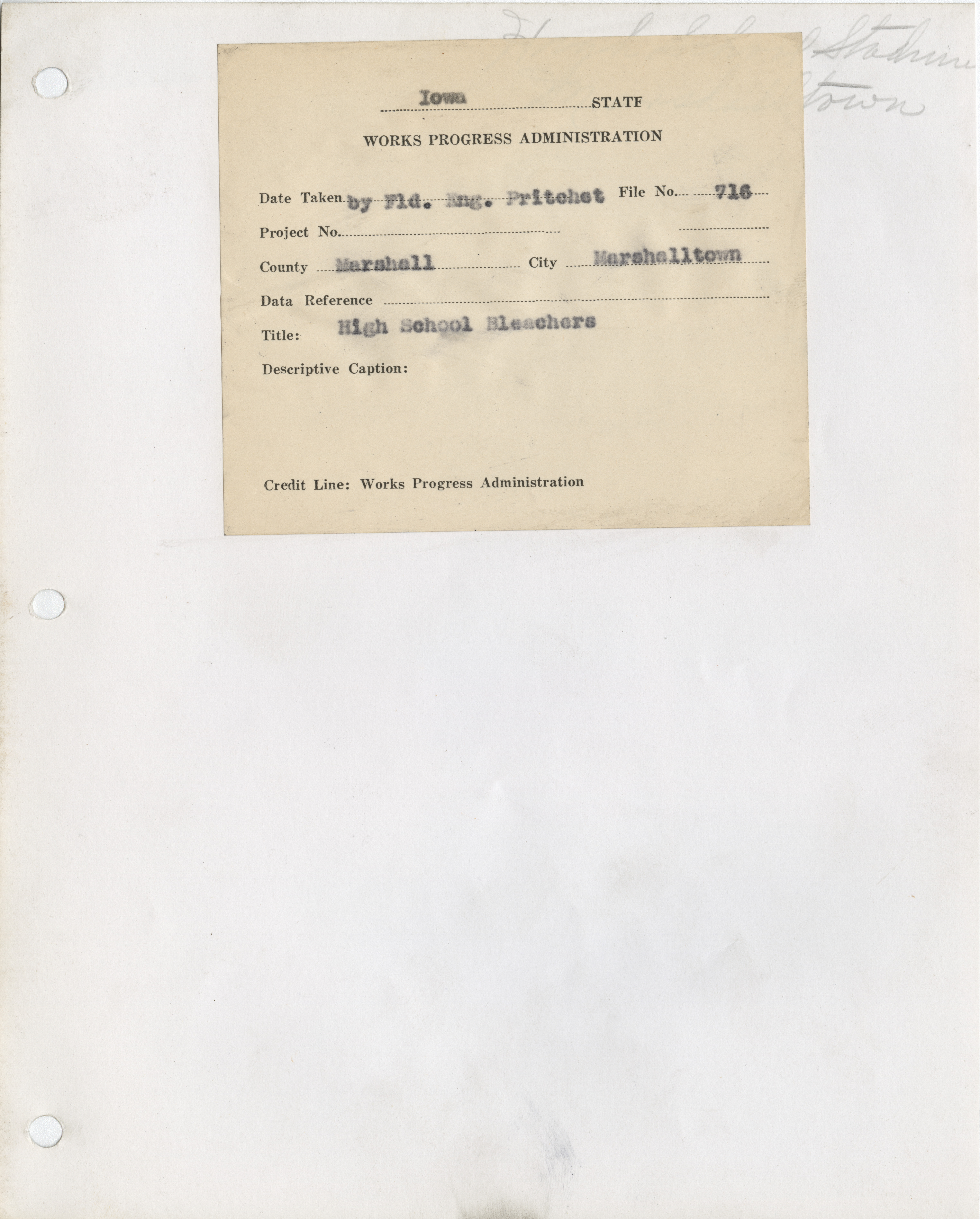- "Photograph of the construction of high school bleachers in Marshalltown", Work Projects Administration (Iowa) Photographs, Iowa State University Library Digital Collections