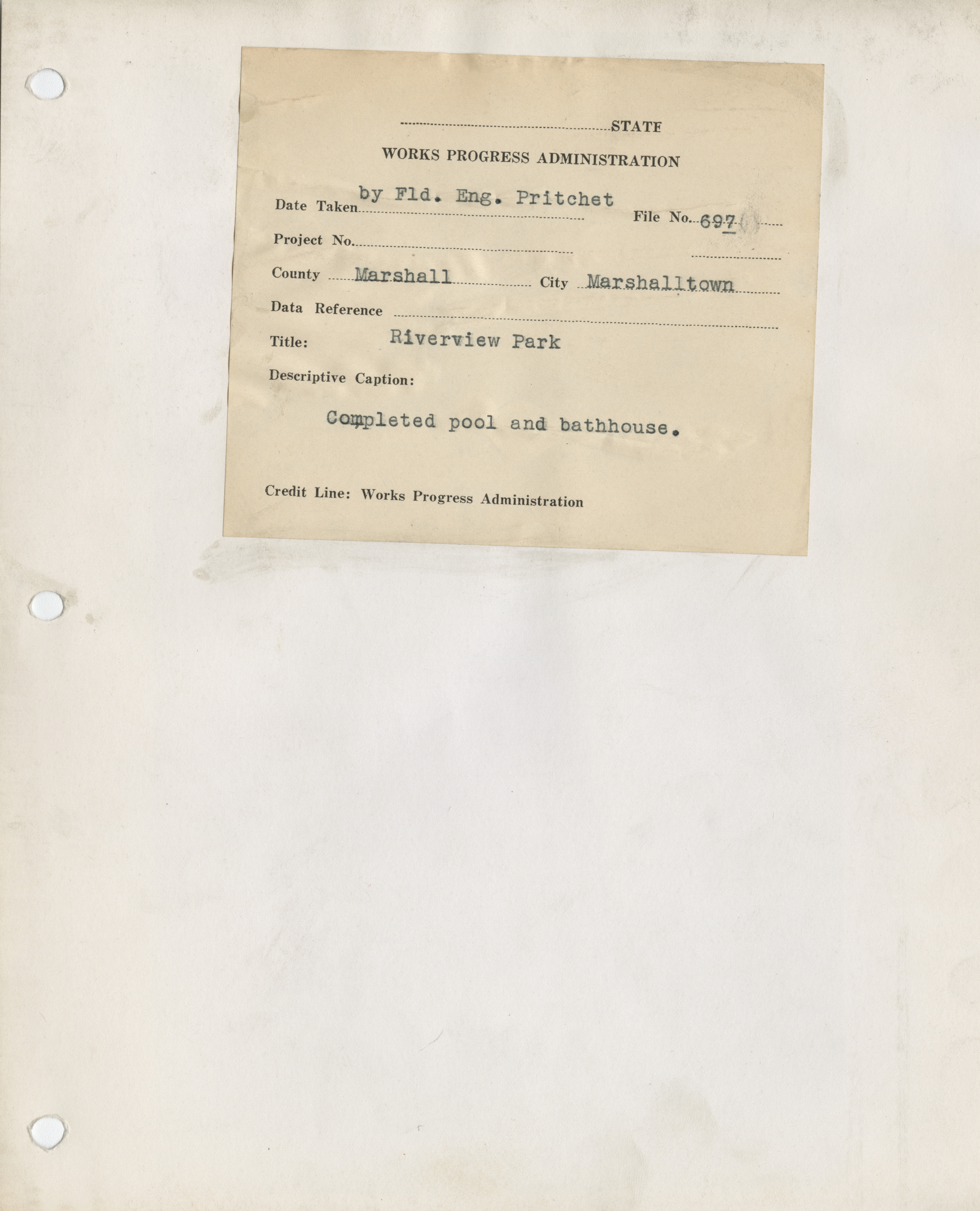 - "Photograph of the pool and bathhouse at Riverview Park in Marshalltown", Work Projects Administration (Iowa) Photographs, Iowa State University Library Digital Collections
