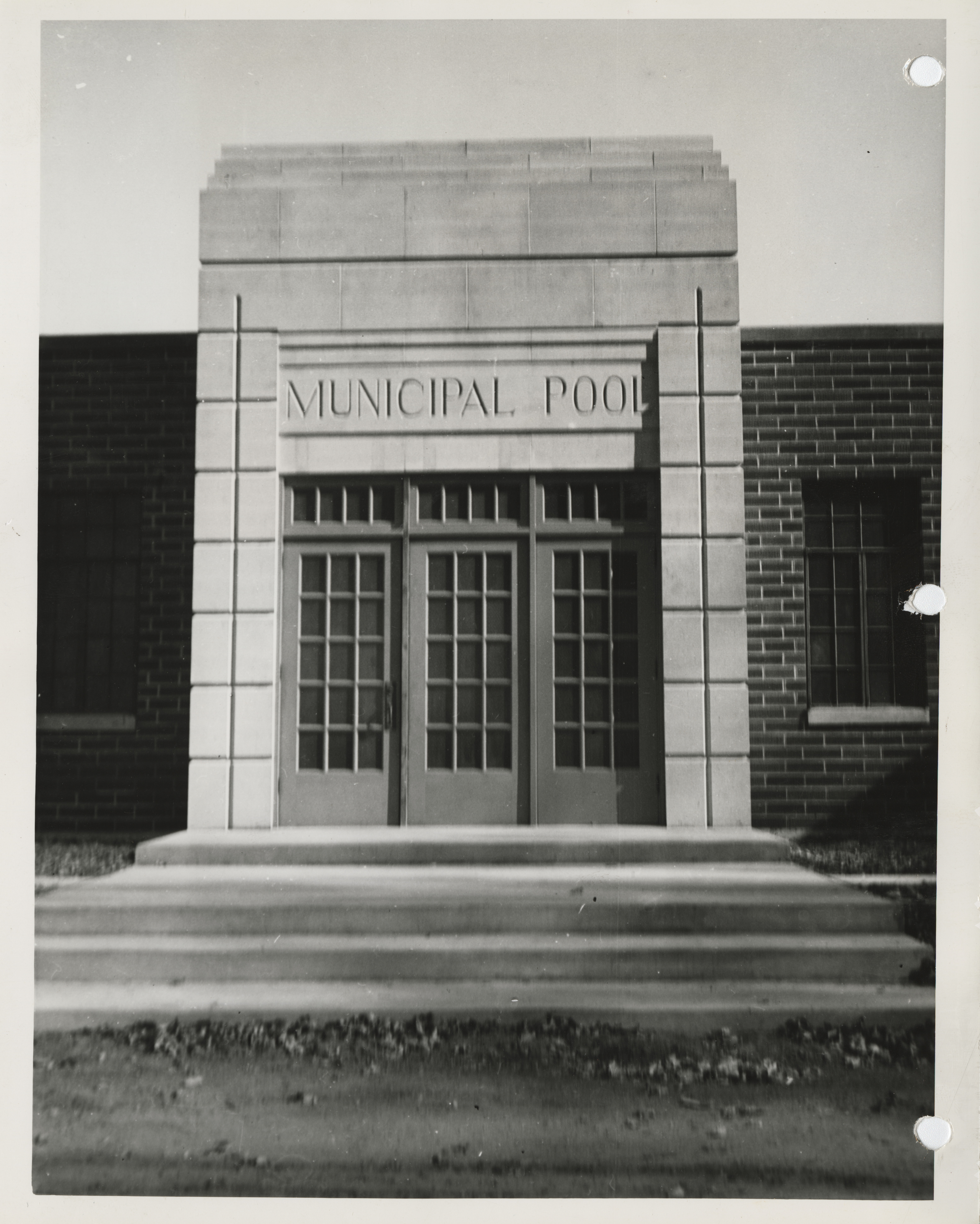 - Photograph of the entrance to the municipal pool at Riverview Park in Marshalltown