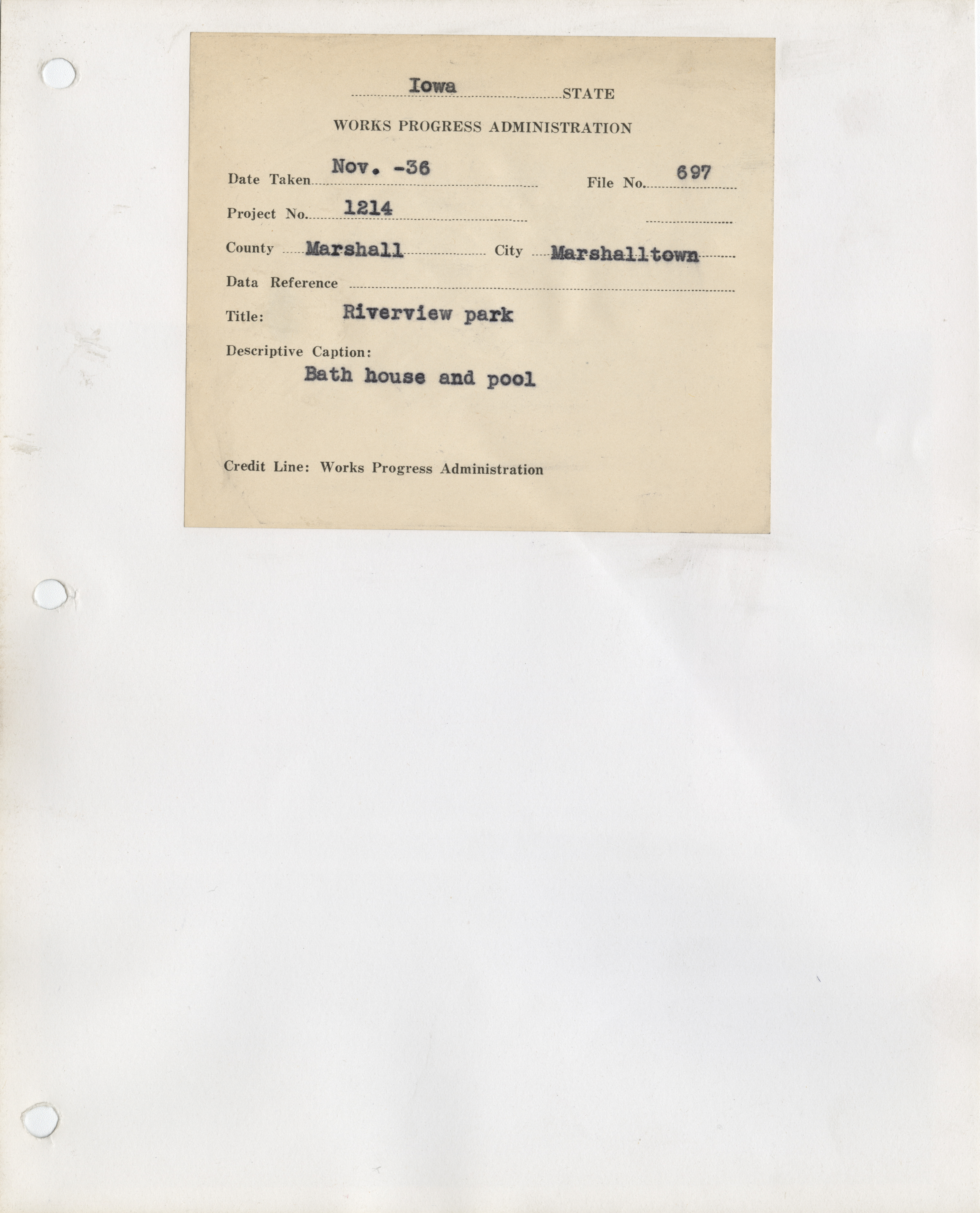 - "Photograph of the entrance to the municipal pool at Riverview Park in Marshalltown", Work Projects Administration (Iowa) Photographs, Iowa State University Library Digital Collections