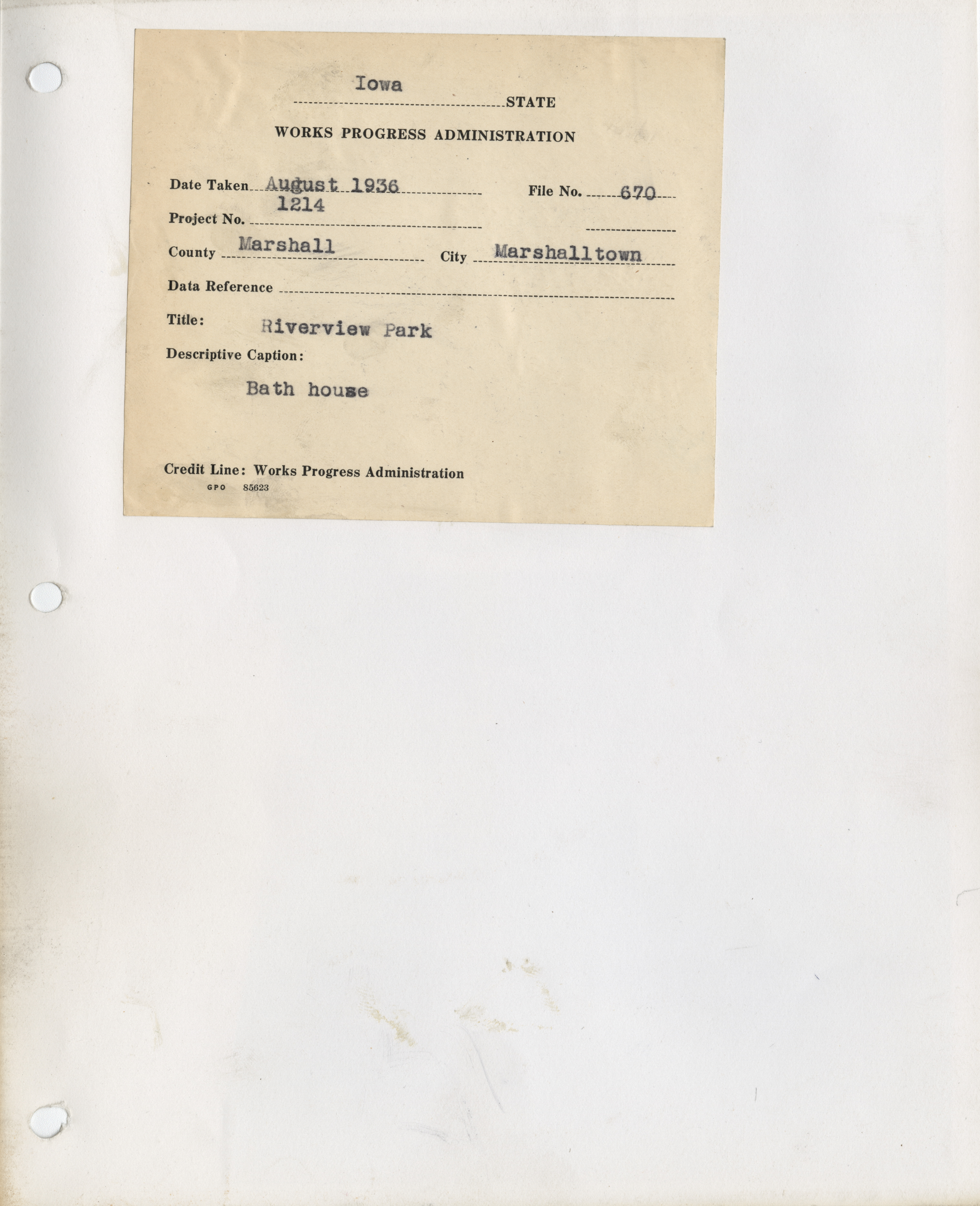 - "Photograph of the construction of the bathhouse at Riverview Park in Marshalltown", Work Projects Administration (Iowa) Photographs, Iowa State University Library Digital Collections