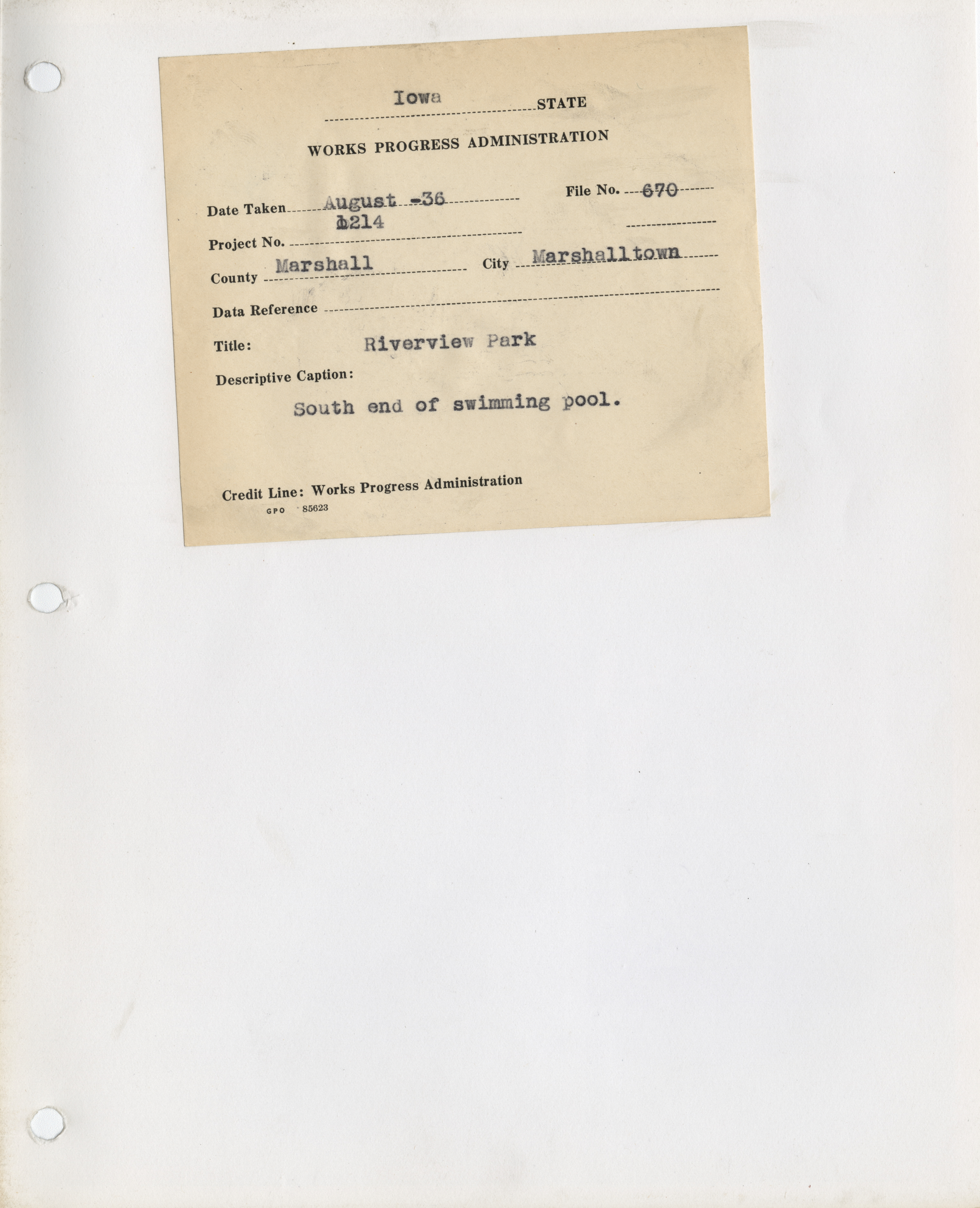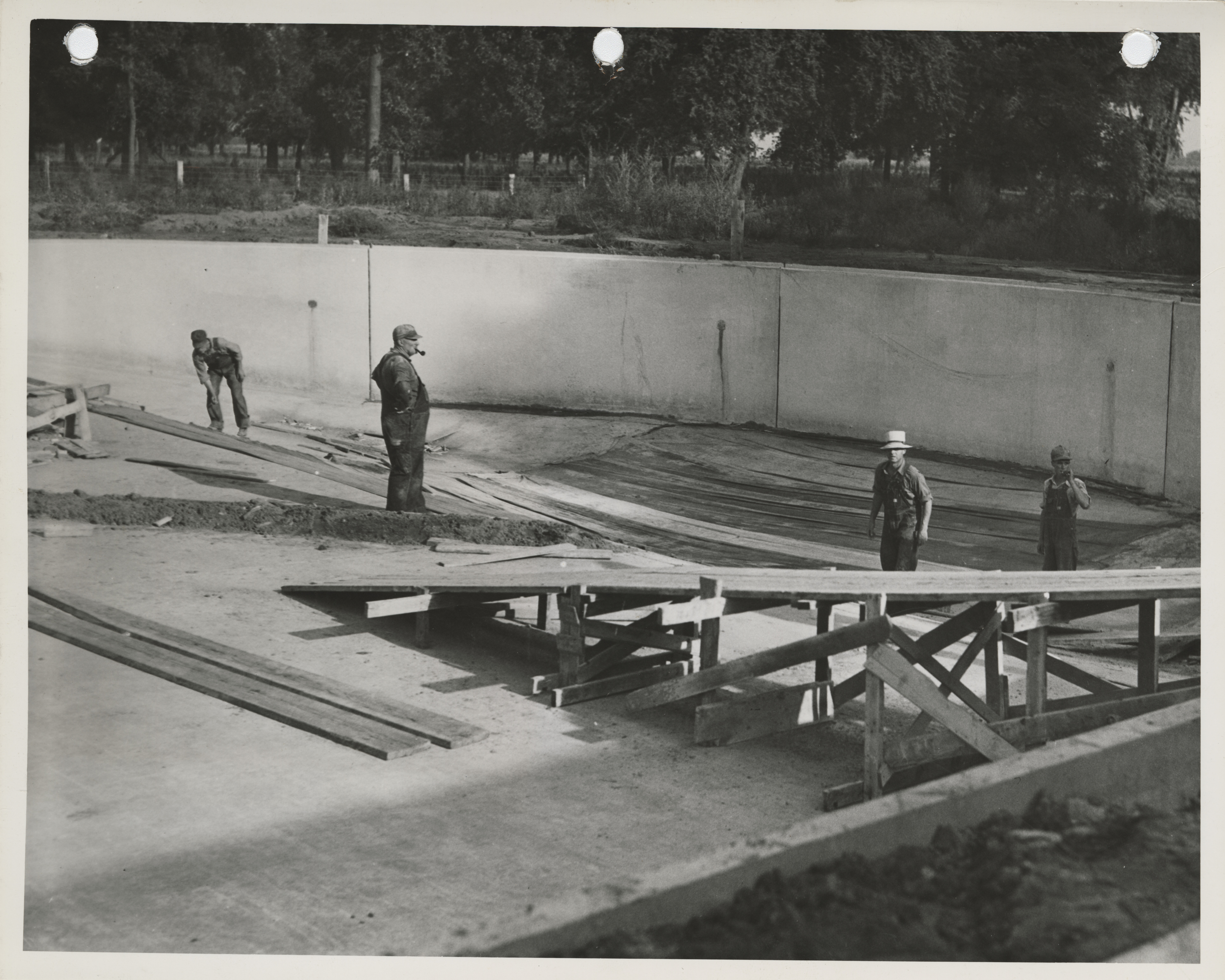 - "Photograph of people working on the south end of the swimming pool at Riverview Park in Marshalltown", Work Projects Administration (Iowa) Photographs, Iowa State University Library Digital Collections
