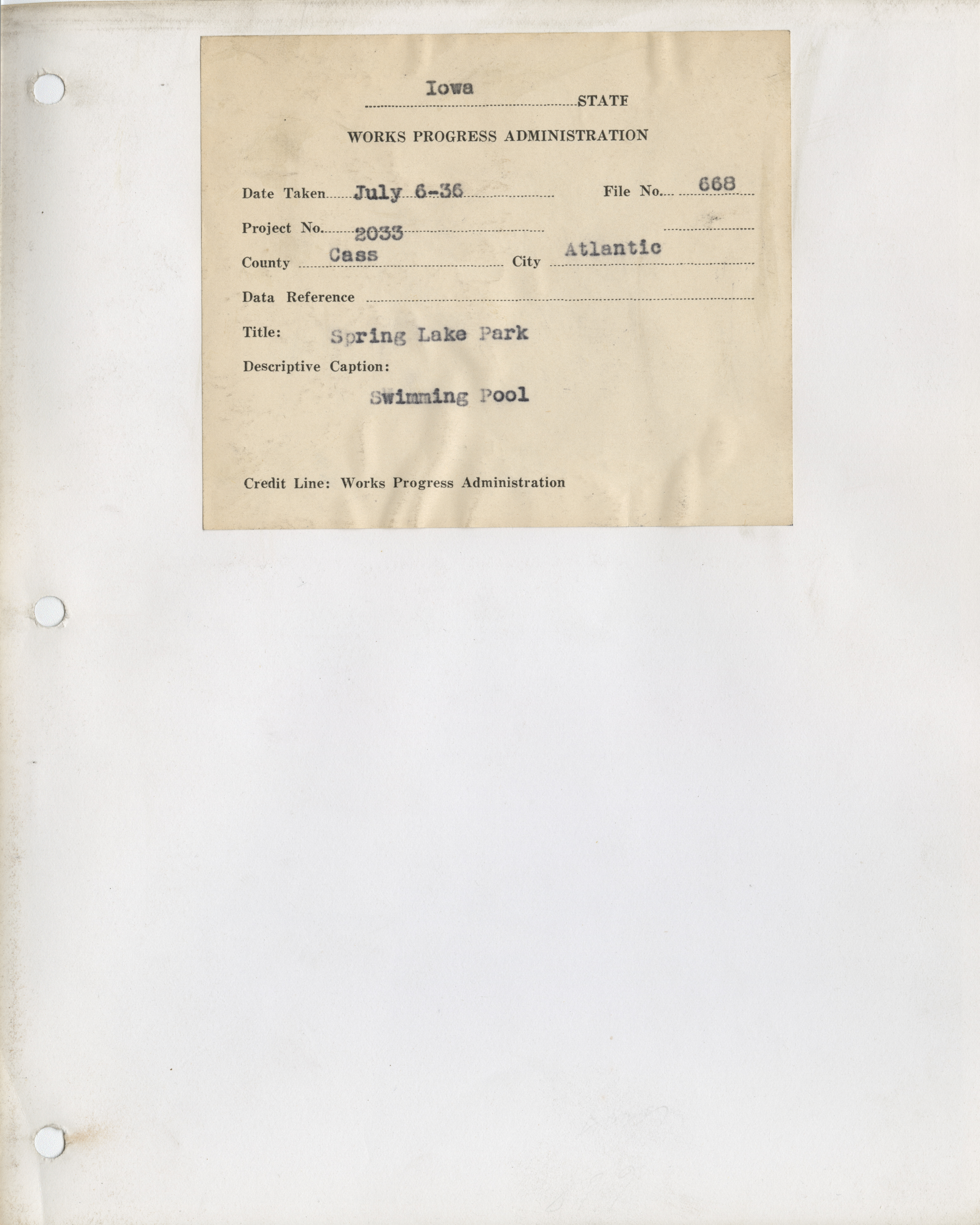 - District 5. Cass County. Atlantic. Sunnyside Park Swimming Pool. Project 2033. (5 b/w photographs), 1936-1938