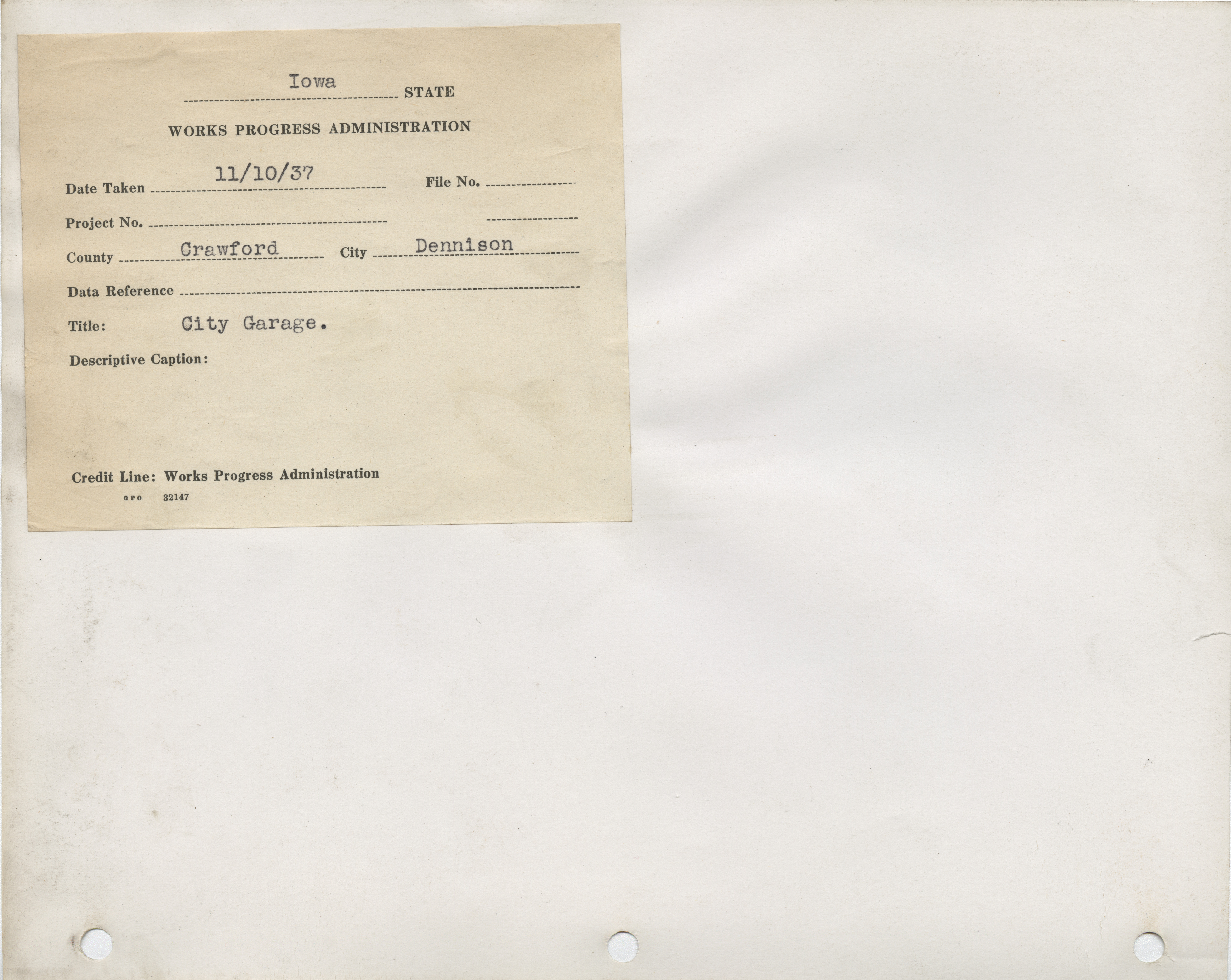 - "Photograph of city garage in Denison", Work Projects Administration (Iowa) Photographs, Iowa State University Library Digital Collections