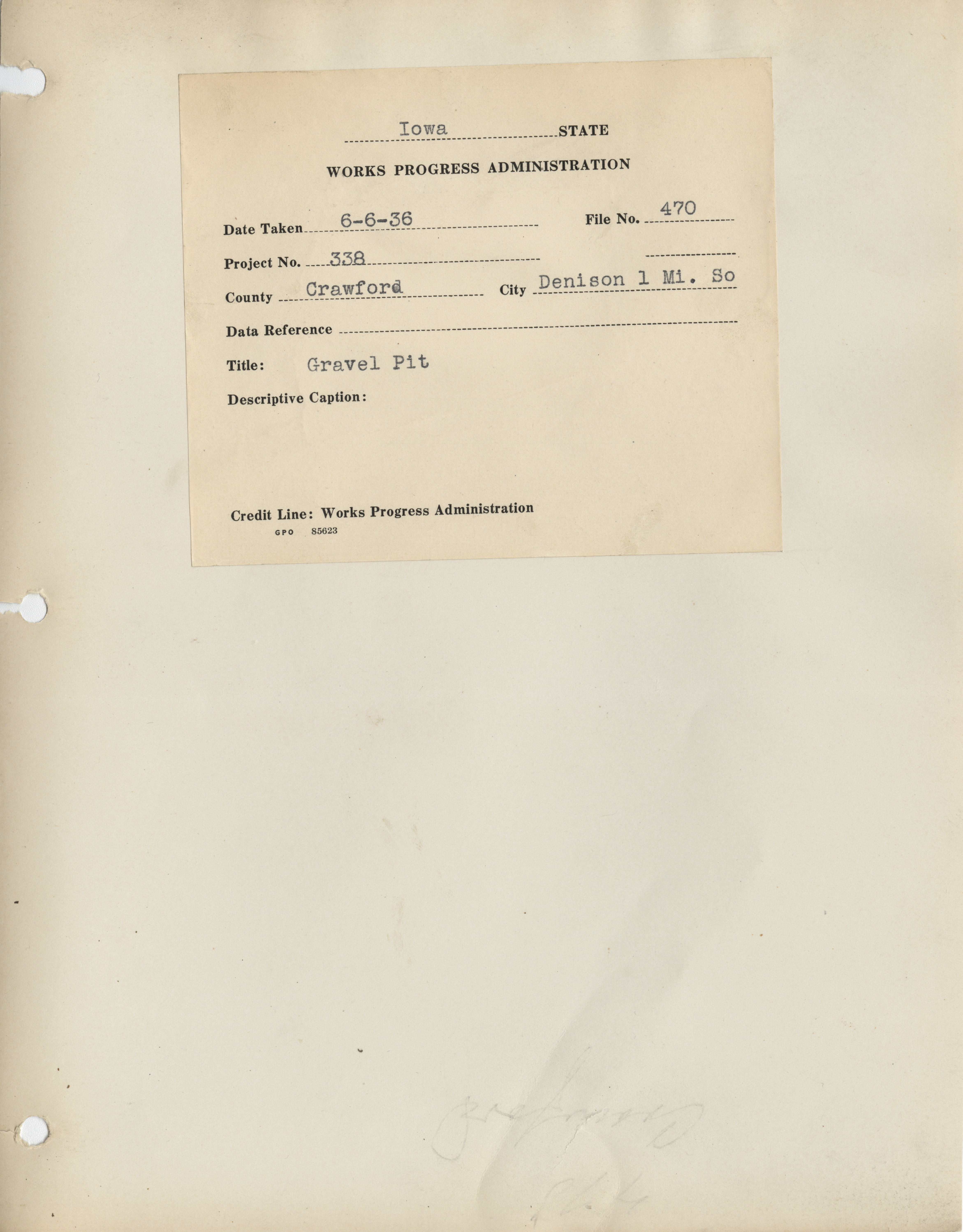 - "Photograph of gravel pit in Denison", Work Projects Administration (Iowa) Photographs, Iowa State University Library Digital Collections