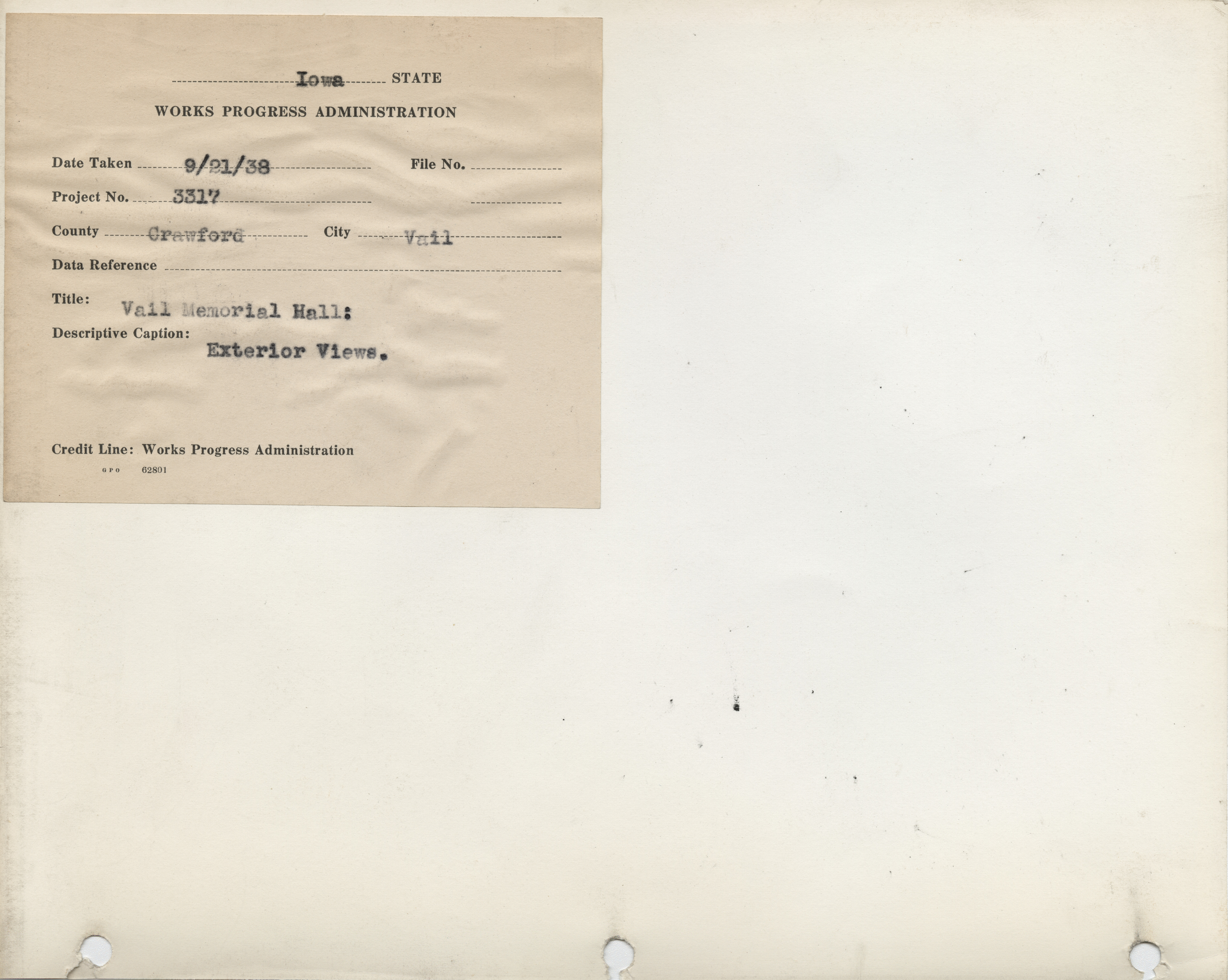 - District 5. Crawford County. Vail. Memorial Hall. Project 3317. (1 b/w photograph), 1938