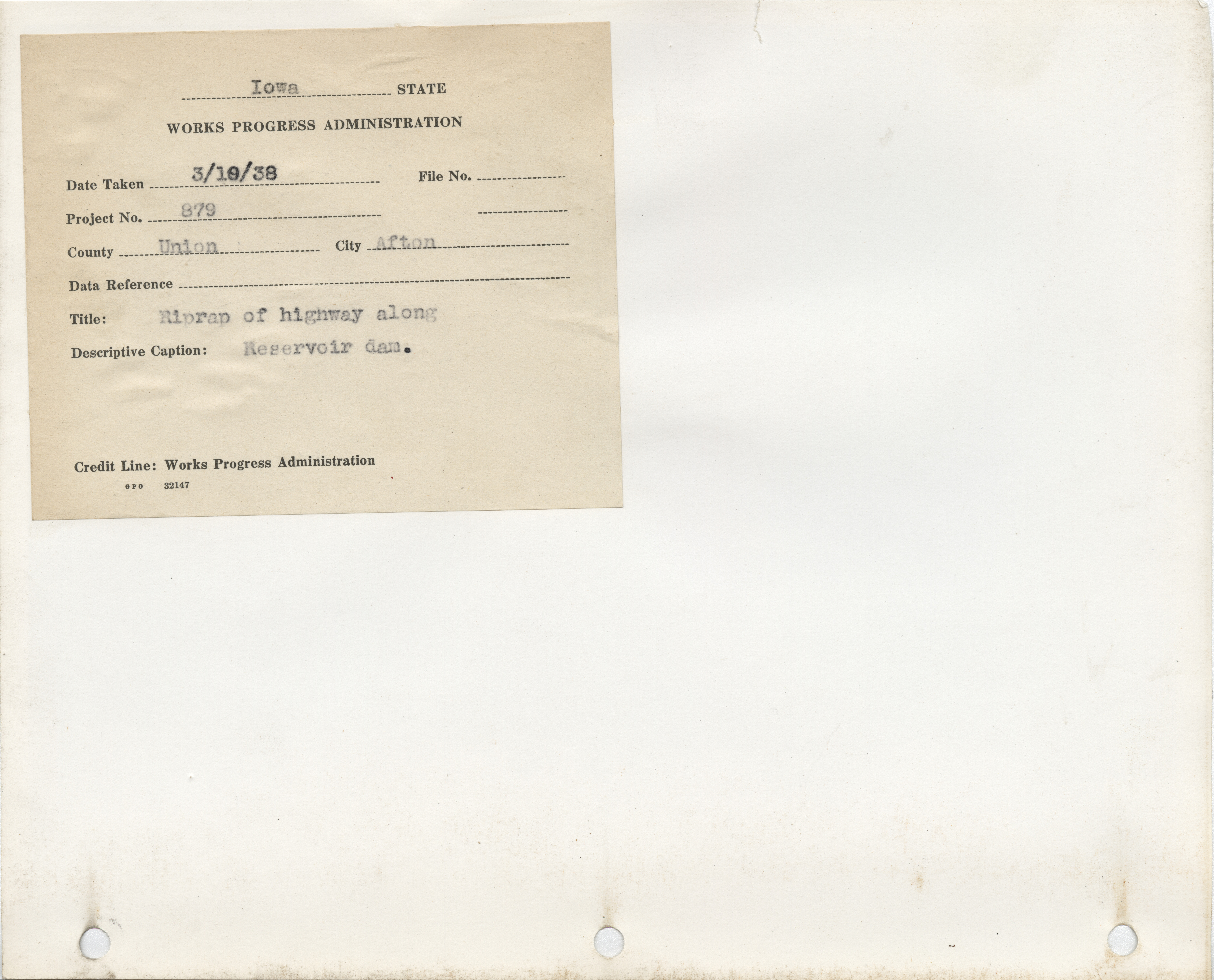 - District 4. Union County. Afton. Riprap of Highway Along Reservoir Dam. Project 879. (1 b/w photograph), 1938