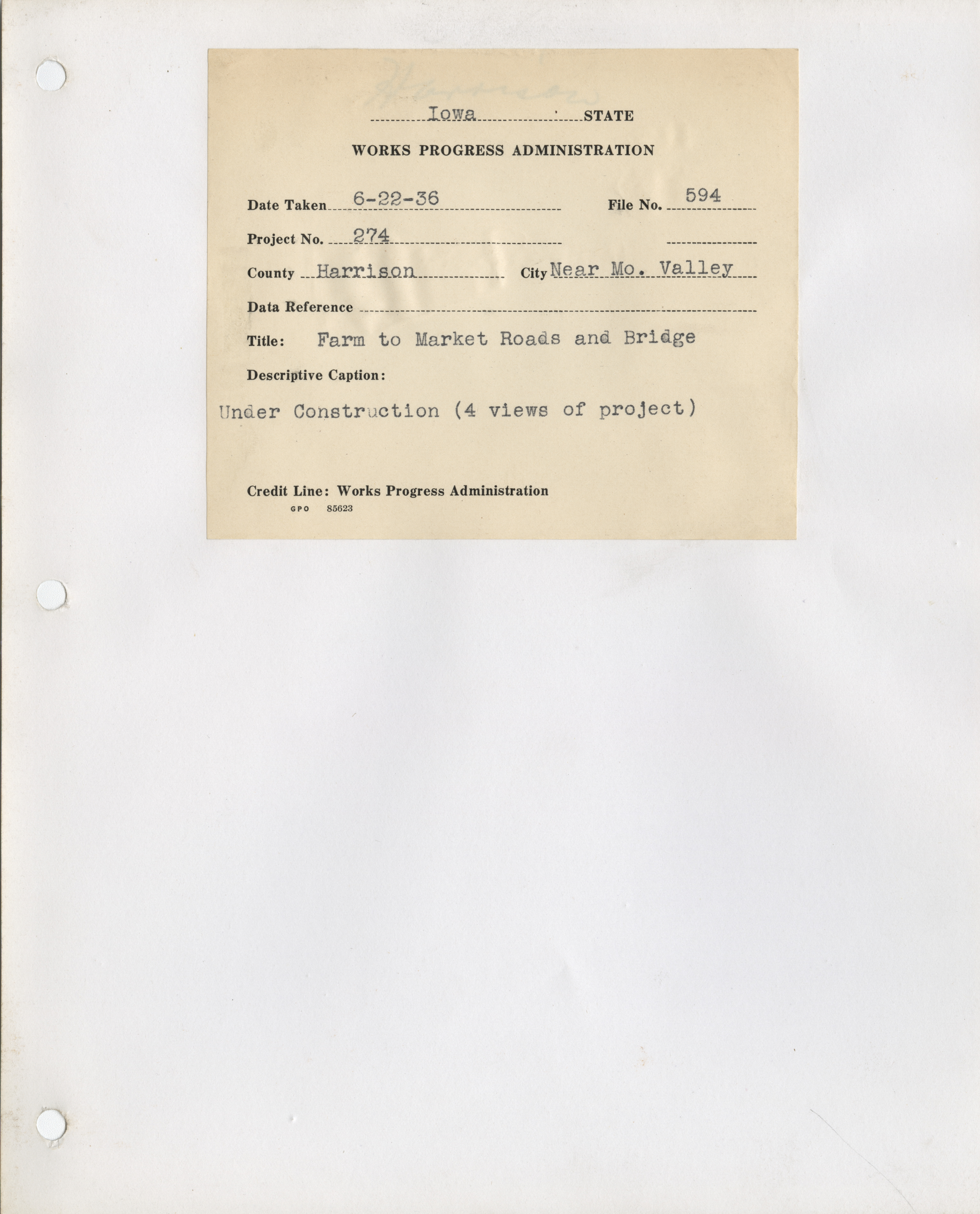 - District 5. Harrison County. Missouri Valley. Farm to Market Roads, and Bridge. Project 274. (4 b/w photographs), 1936