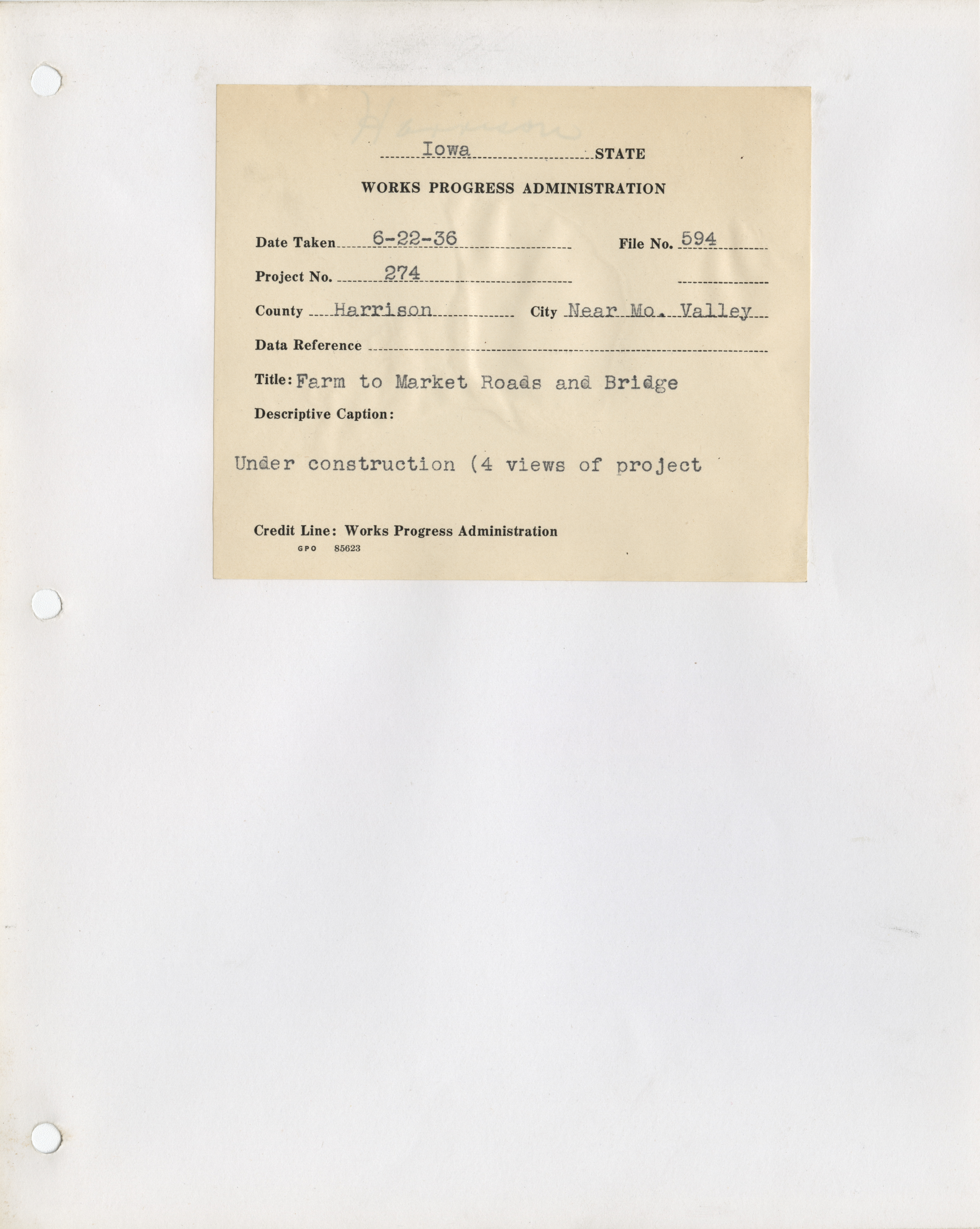 - District 5. Harrison County. Missouri Valley. Farm to Market Roads, and Bridge. Project 274. (4 b/w photographs), 1936