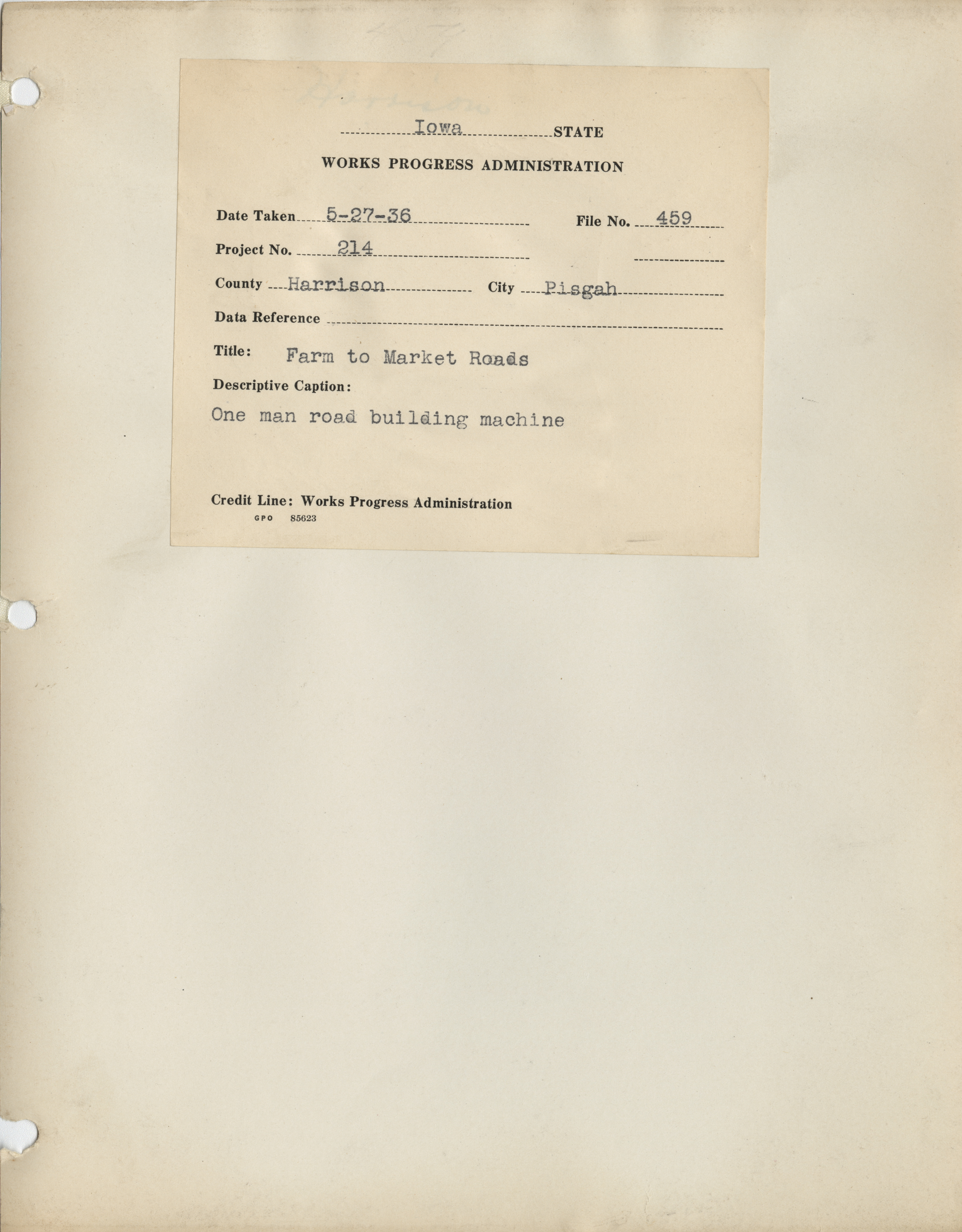 - "Photograph of a road building machine at the farm-to-market road in Pisgah", Work Projects Administration (Iowa) Photographs, Iowa State University Library Digital Collections