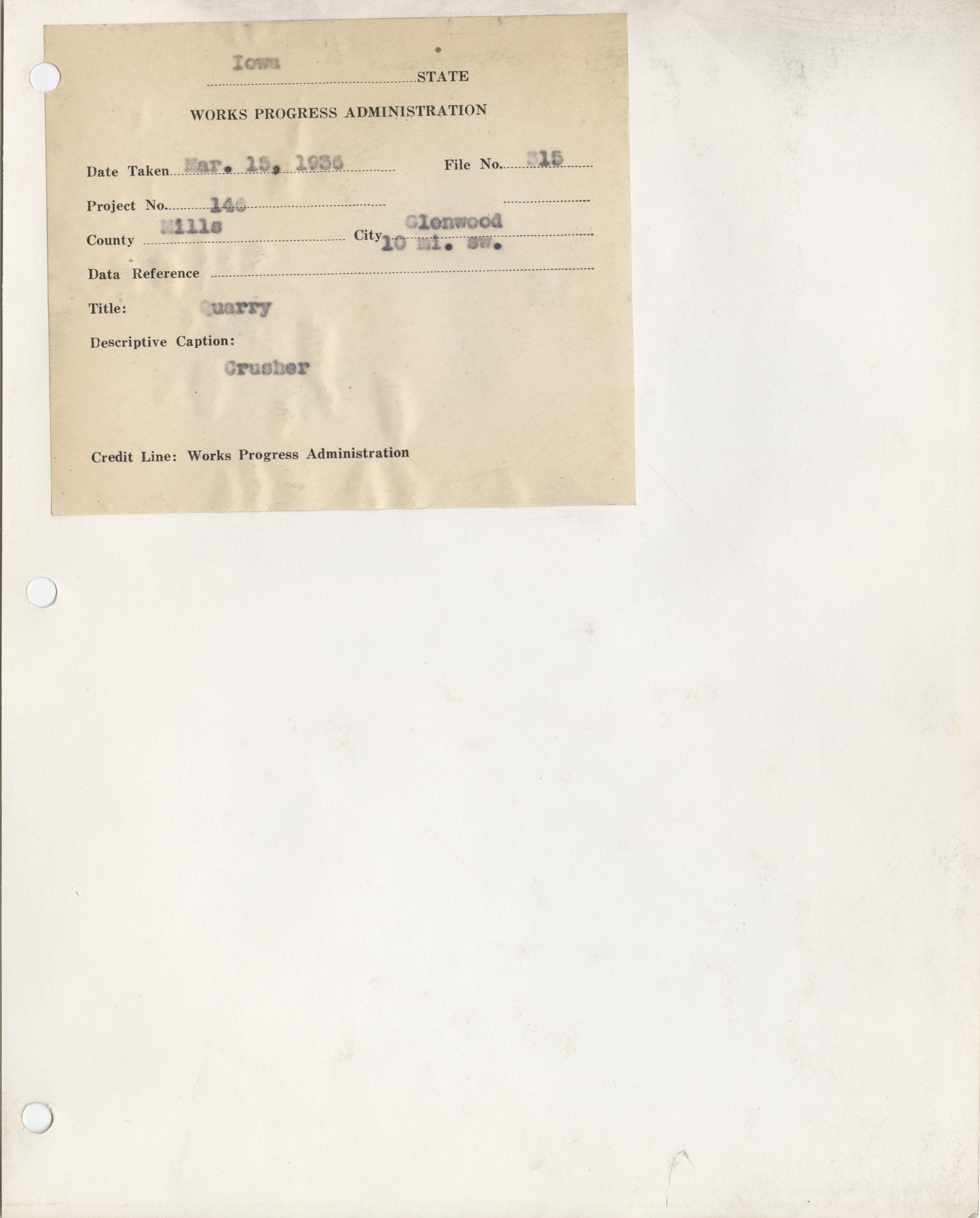 - "Photograph of rock crusher at the quarry in Glenwood", Work Projects Administration (Iowa) Photographs, Iowa State University Library Digital Collections