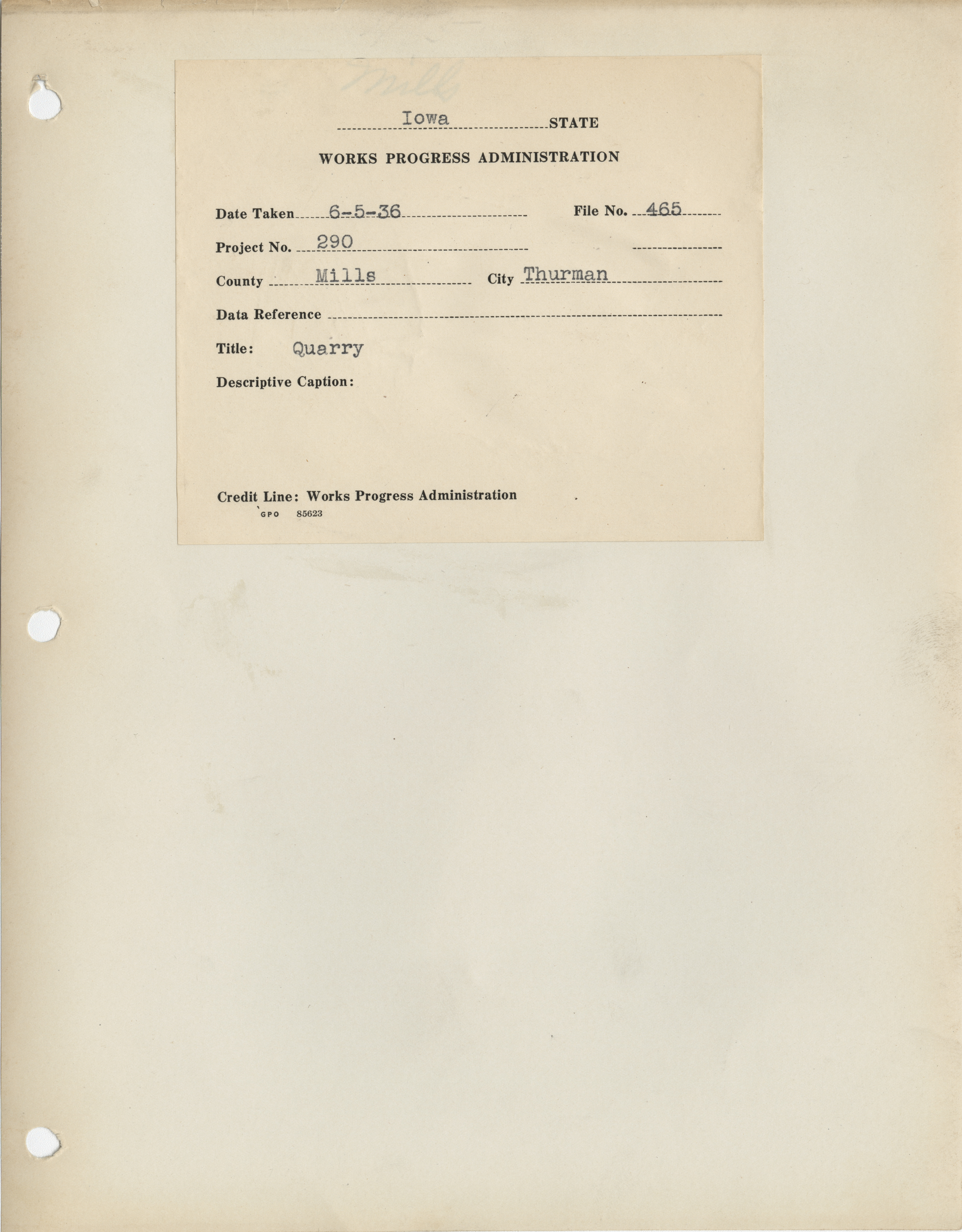 - District 5. Mills County. Thurman. Quarry. Project 290. (2 b/w photographs), 1936