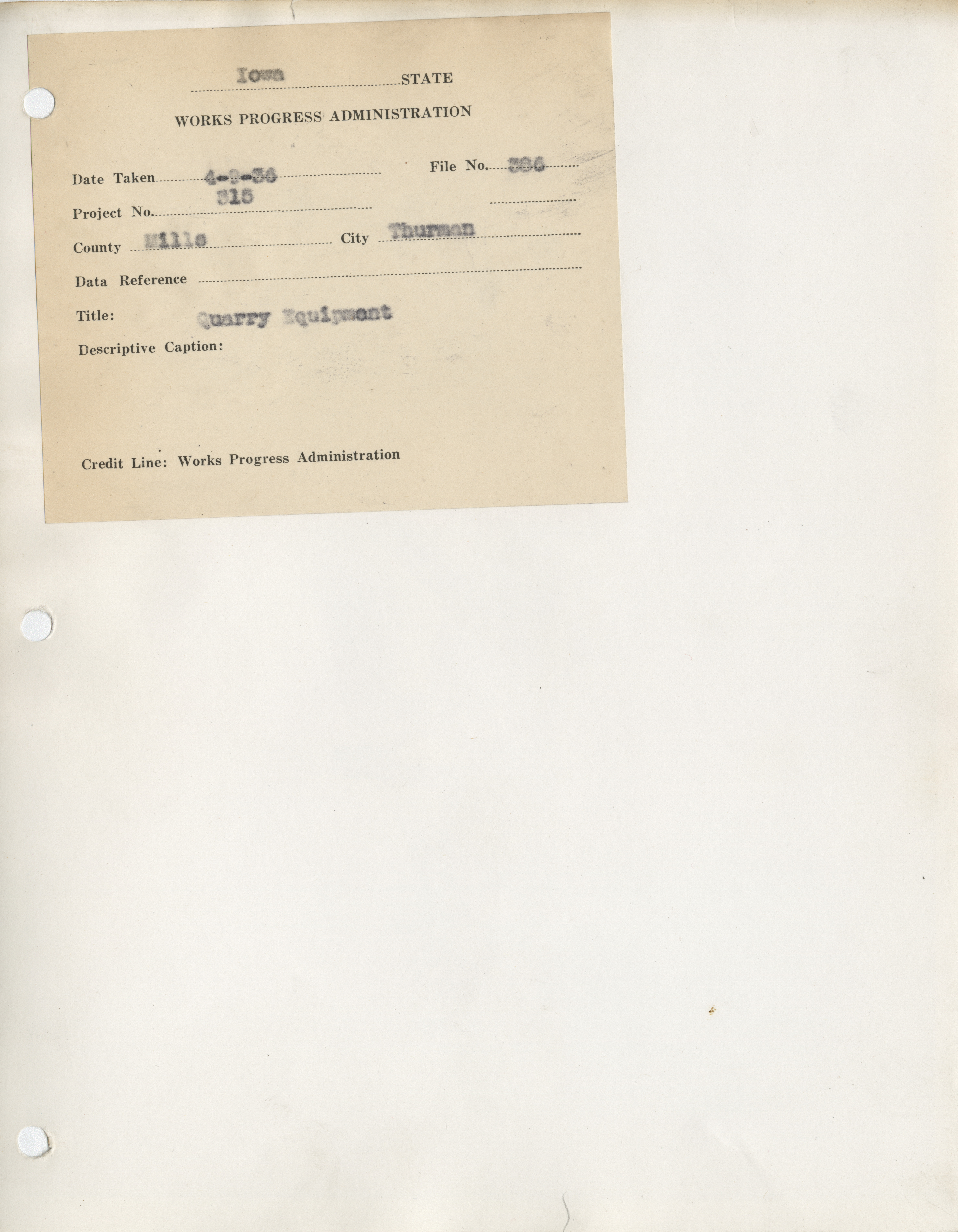 - "Photograph of equipment at the quarry in Thurman", Work Projects Administration (Iowa) Photographs, Iowa State University Library Digital Collections