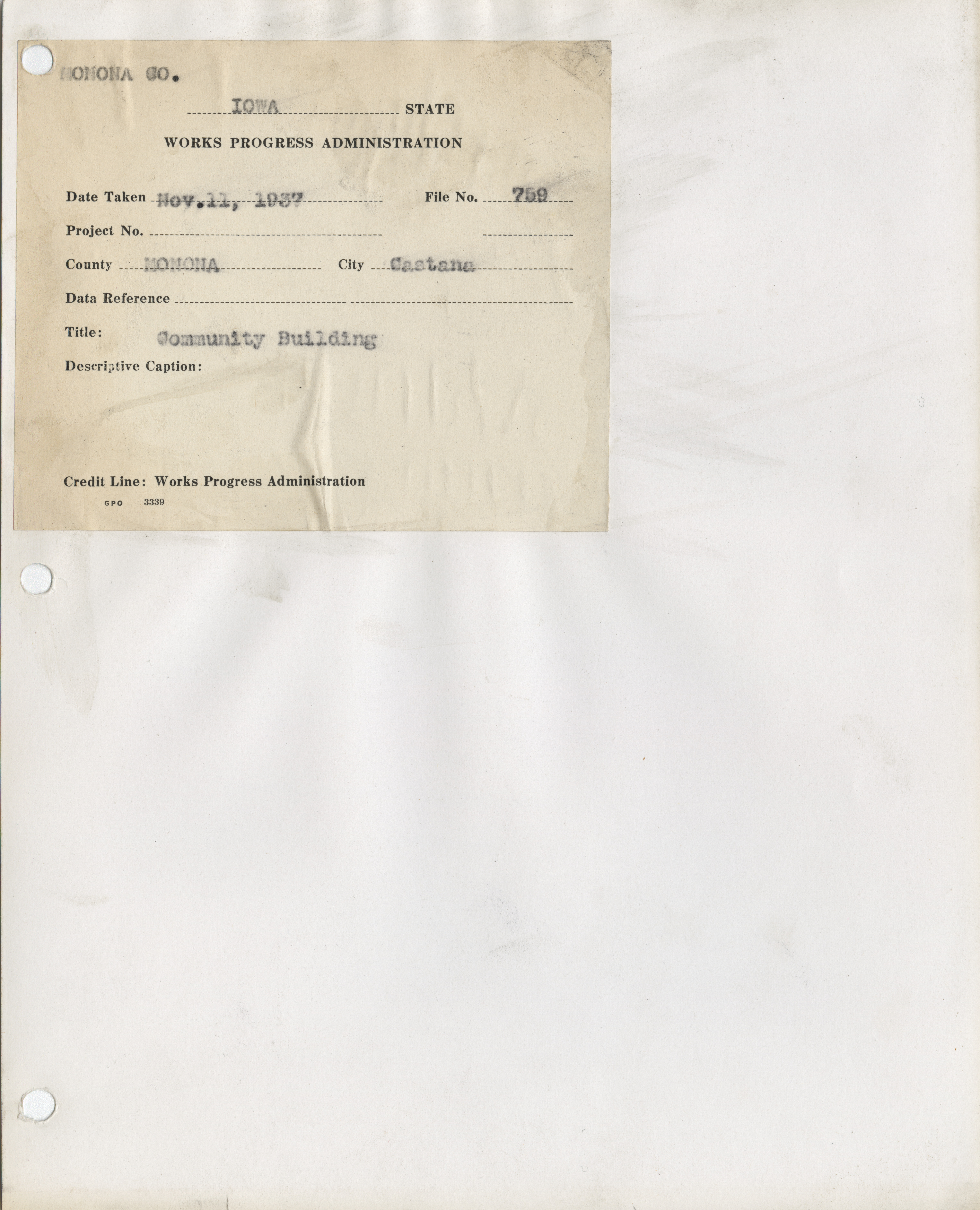 - District 5. Monona County. Castana. Community Building. (1 b/w photograph), 1937