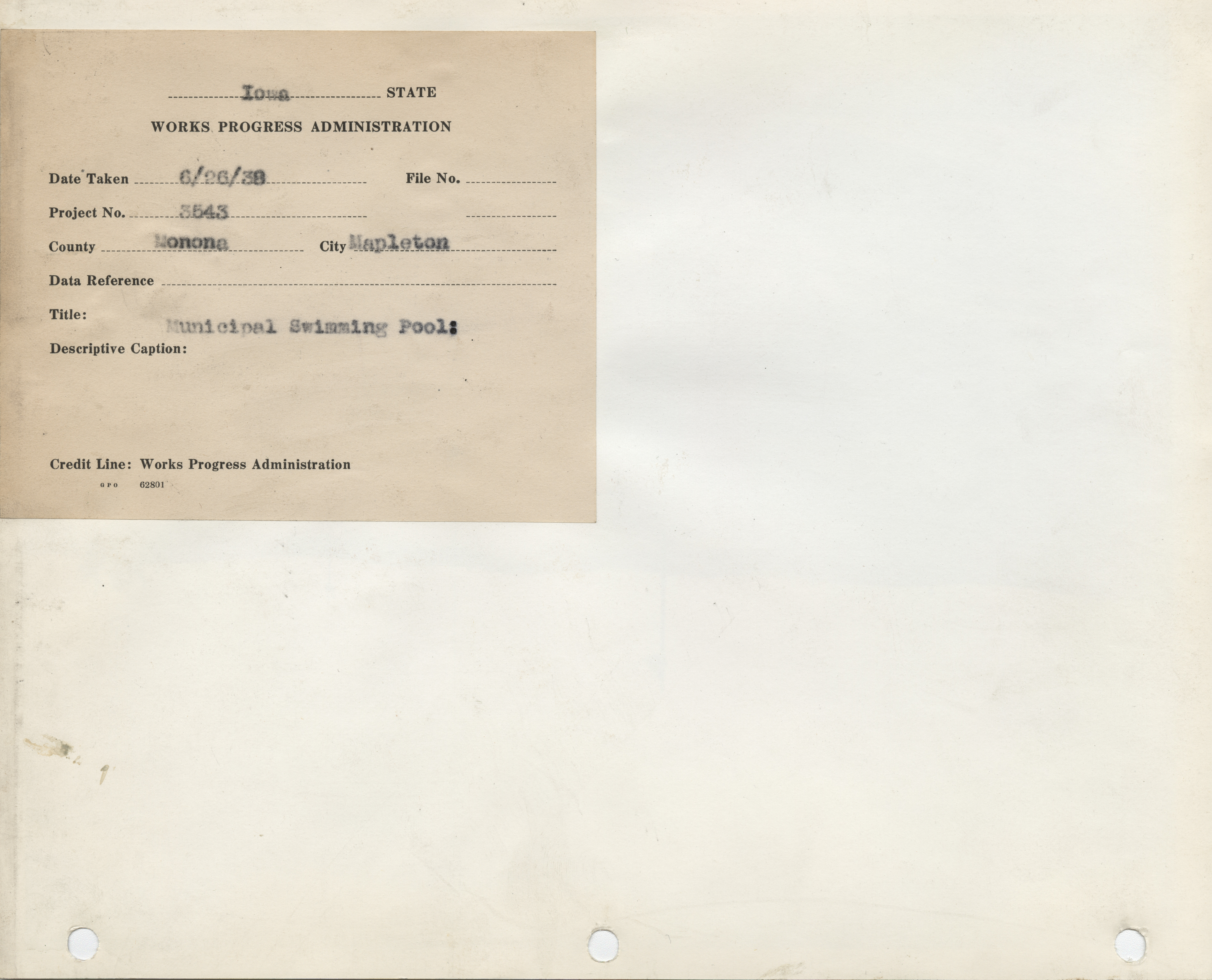 - District 5. Monona County. Mapleton. Swimming Pool. Project 3543. (3 b/w photographs), 1938