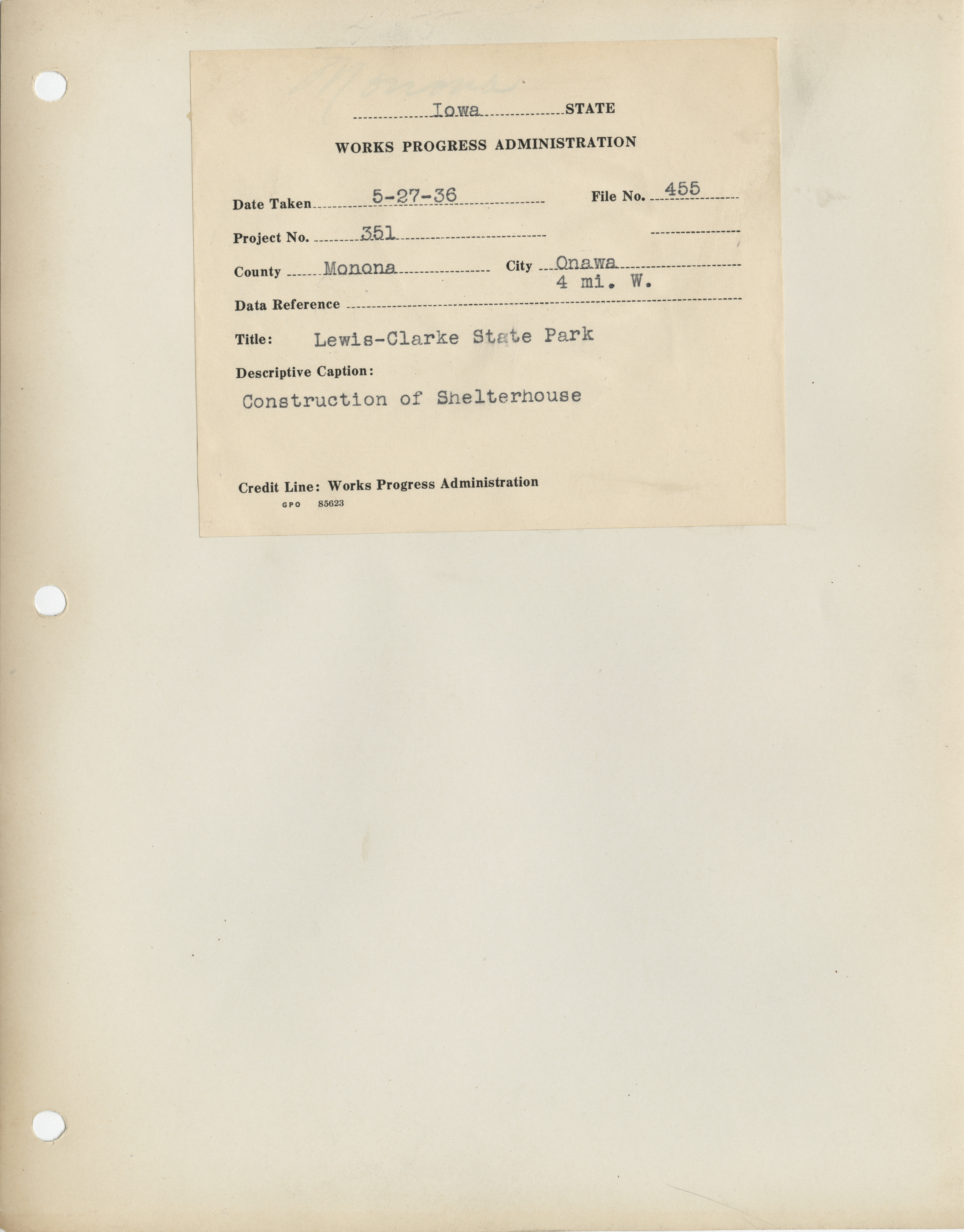 - "Photograph of the construction of shelter house in the Lewis and Clark State Park", Work Projects Administration (Iowa) Photographs, Iowa State University Library Digital Collections