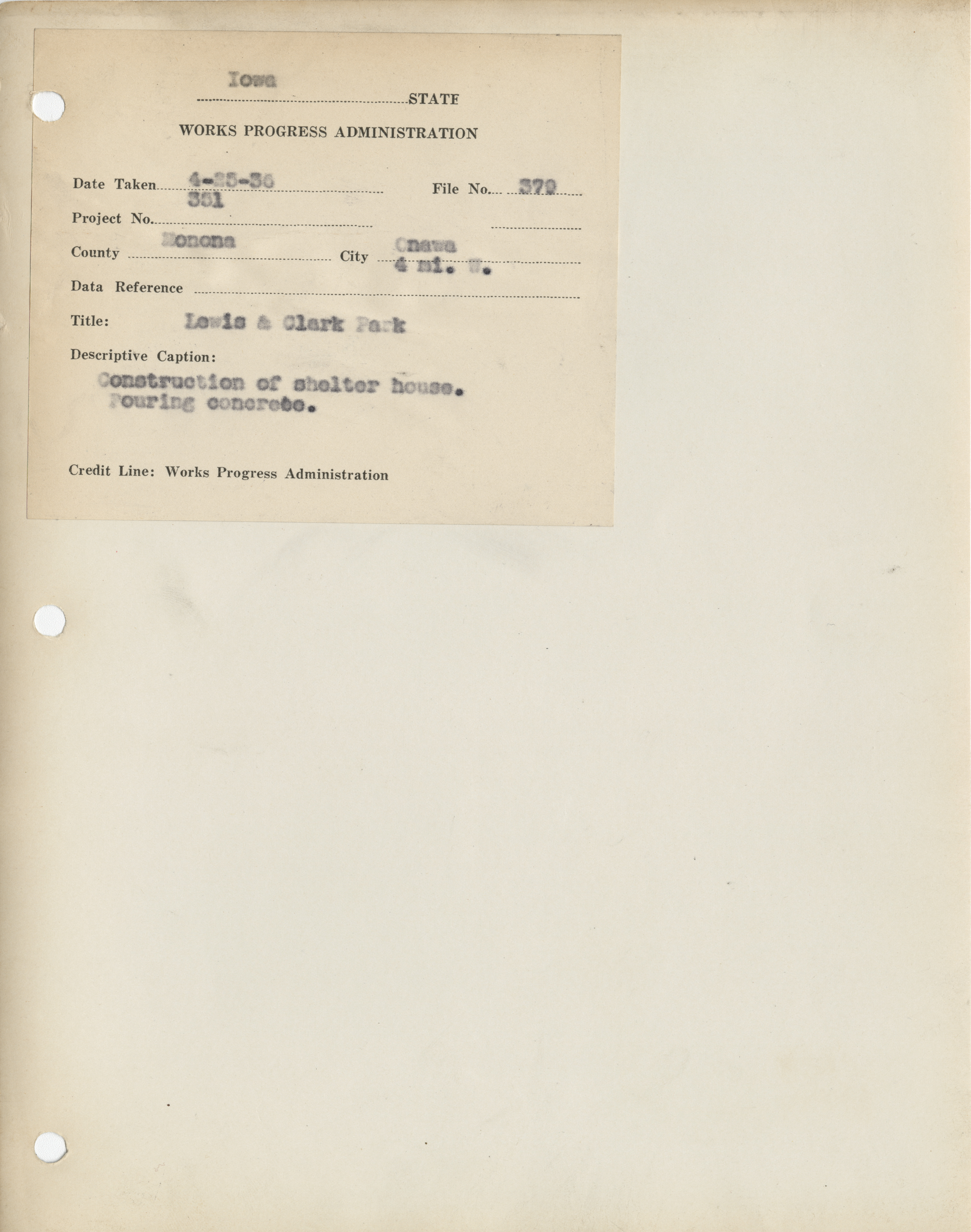- "Photograph of the construction of shelter house in the Lewis and Clark State Park", Work Projects Administration (Iowa) Photographs, Iowa State University Library Digital Collections