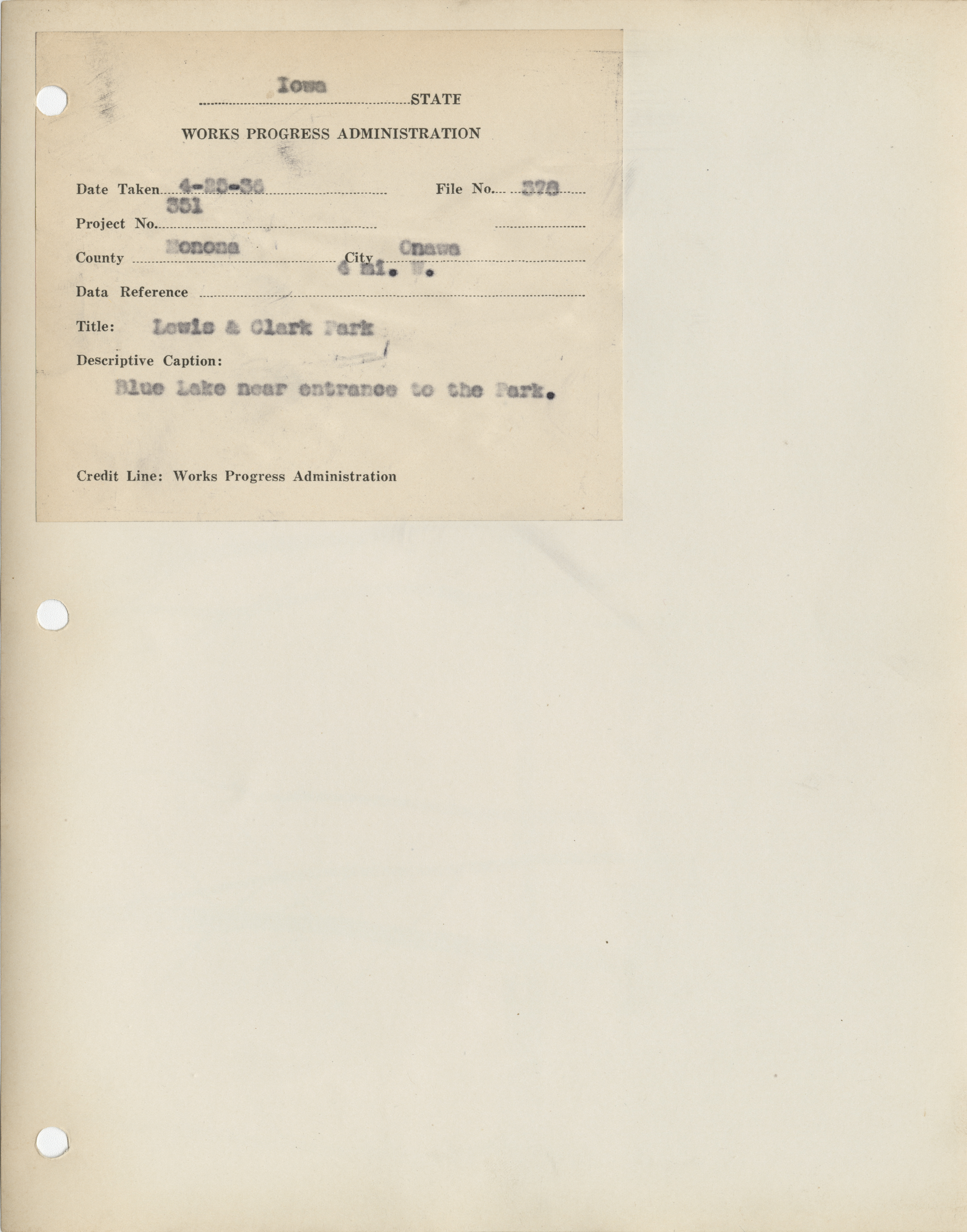 - "Photograph of the Blue Lake near the Lewis and Clark State Park entrance", Work Projects Administration (Iowa) Photographs, Iowa State University Library Digital Collections