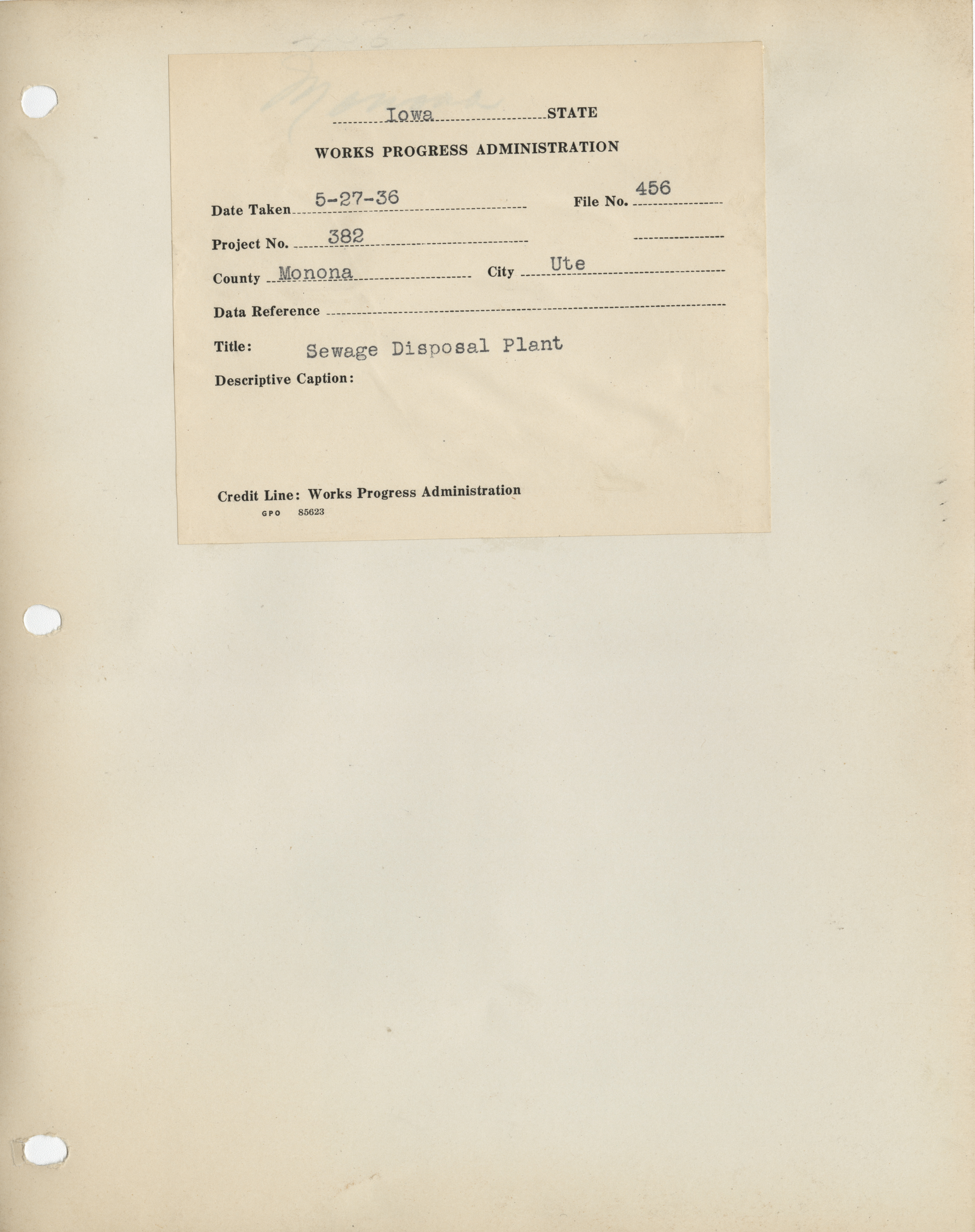 - District 5. Monona County. Ute. Sewage Disposal Plant. Project 382. (2 b/w photographs), 1936