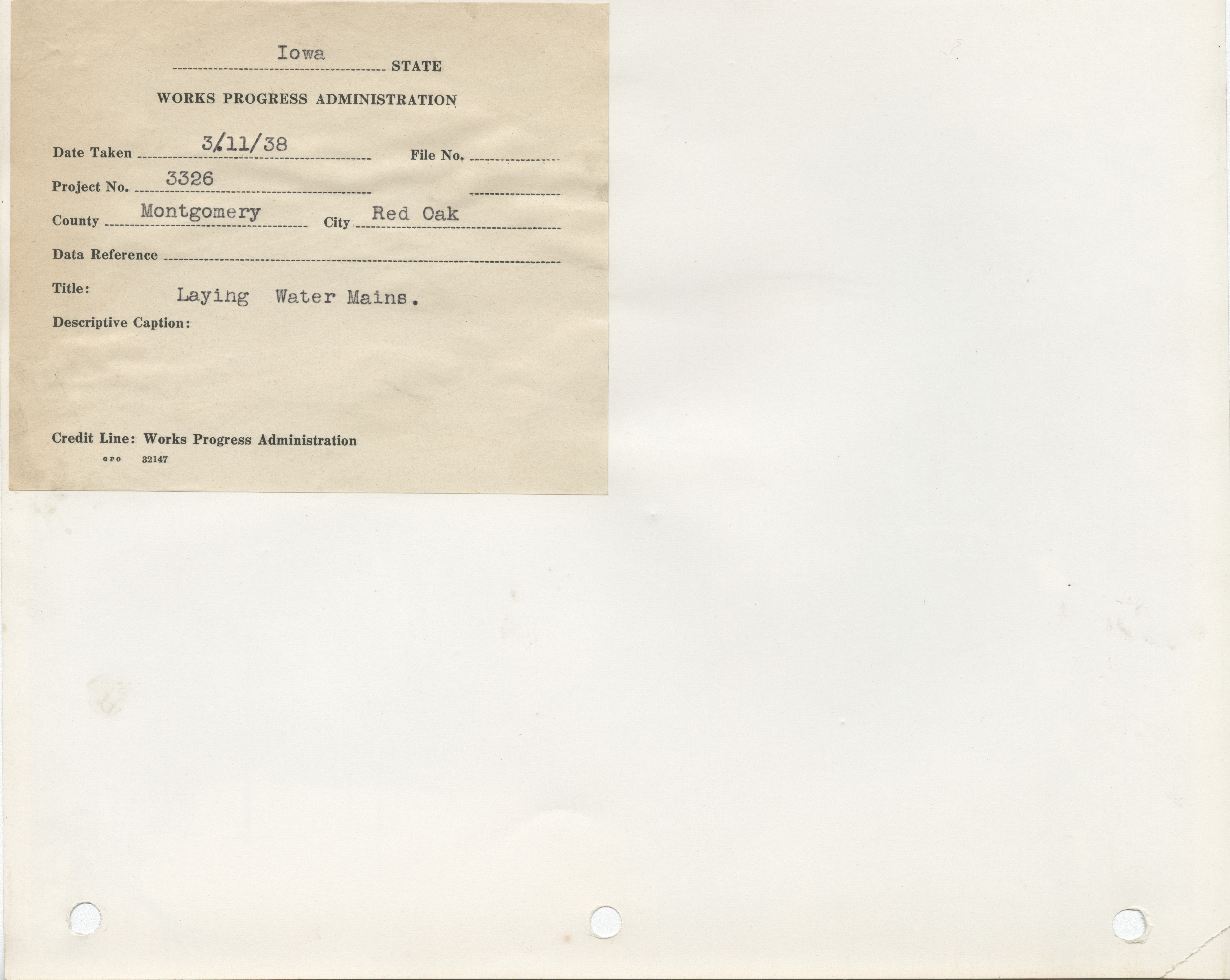 - "Photograph of laying water mains Red Oak", Work Projects Administration (Iowa) Photographs, Iowa State University Library Digital Collections