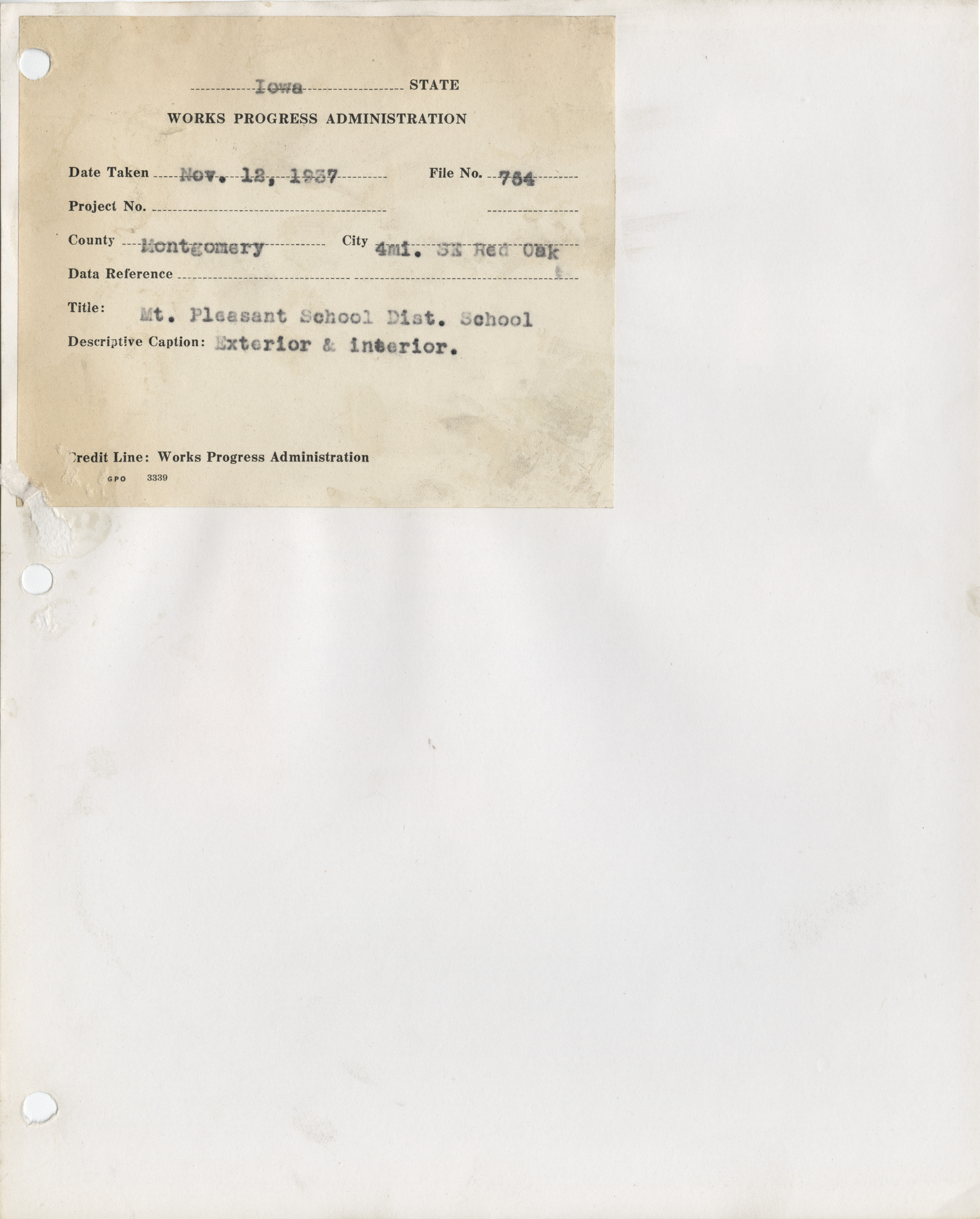 - District 5. Montgomery County. Red Oak. Mount Pleasant School District School. Project 3533. (3 b/w photographs), 1937-1938