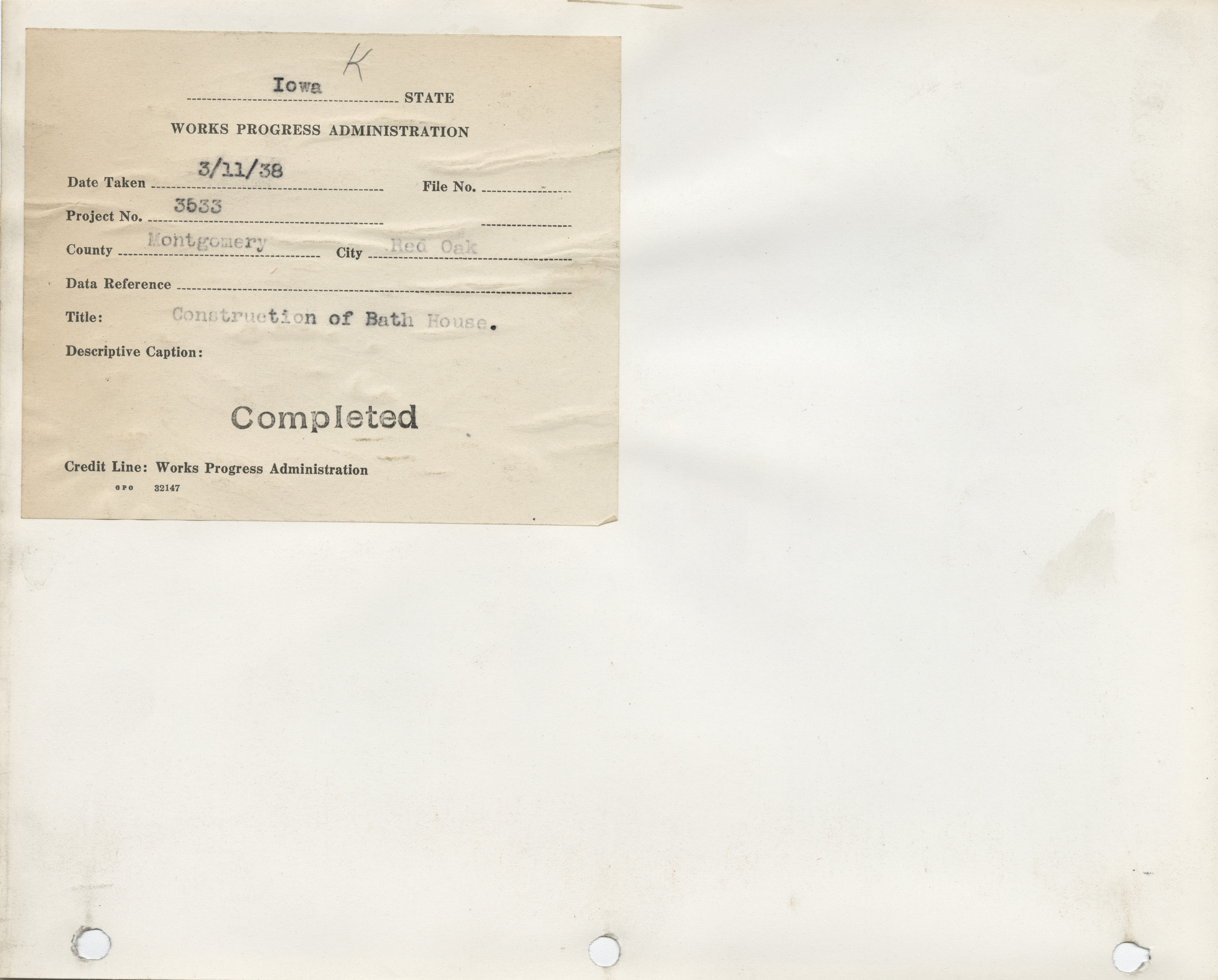 - "Photograph of the construction of bathhouse in Red Oak", Work Projects Administration (Iowa) Photographs, Iowa State University Library Digital Collections