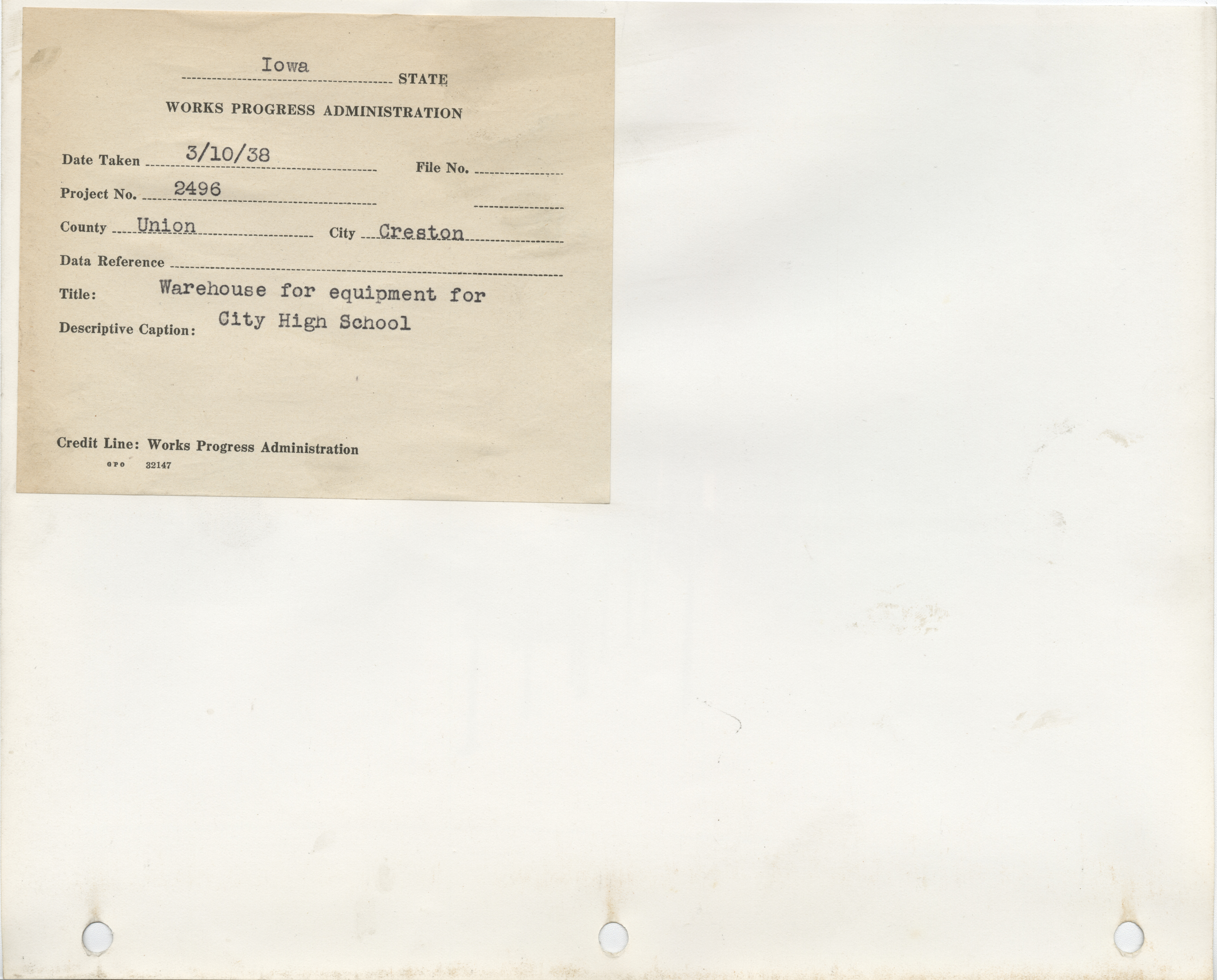 - District 4. Union County. Creston. Warehouse for High School Equipment. Project 2496. (1 b/w photograph), 1938