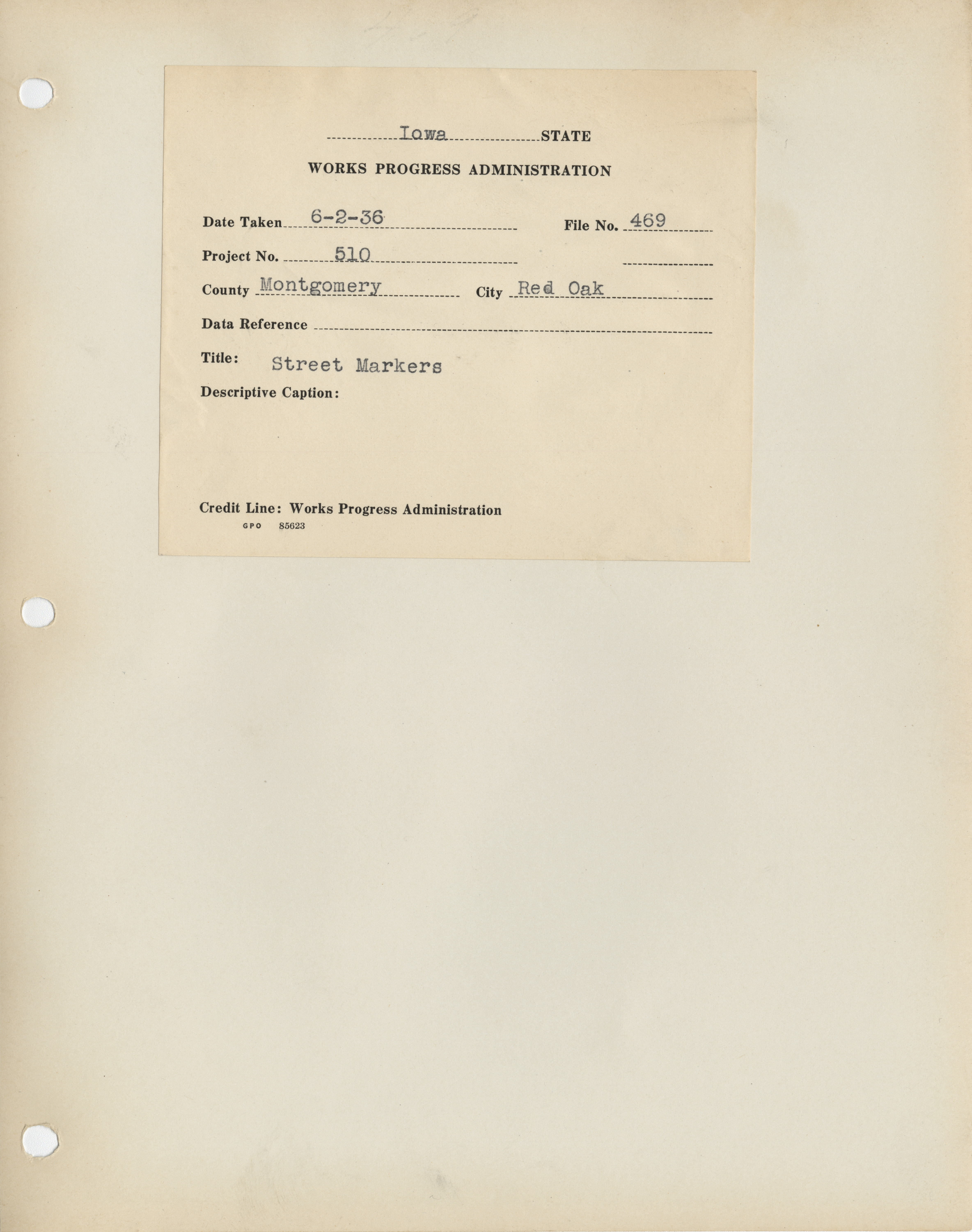 - "Photograph of street markers in Red Oak", Work Projects Administration (Iowa) Photographs, Iowa State University Library Digital Collections