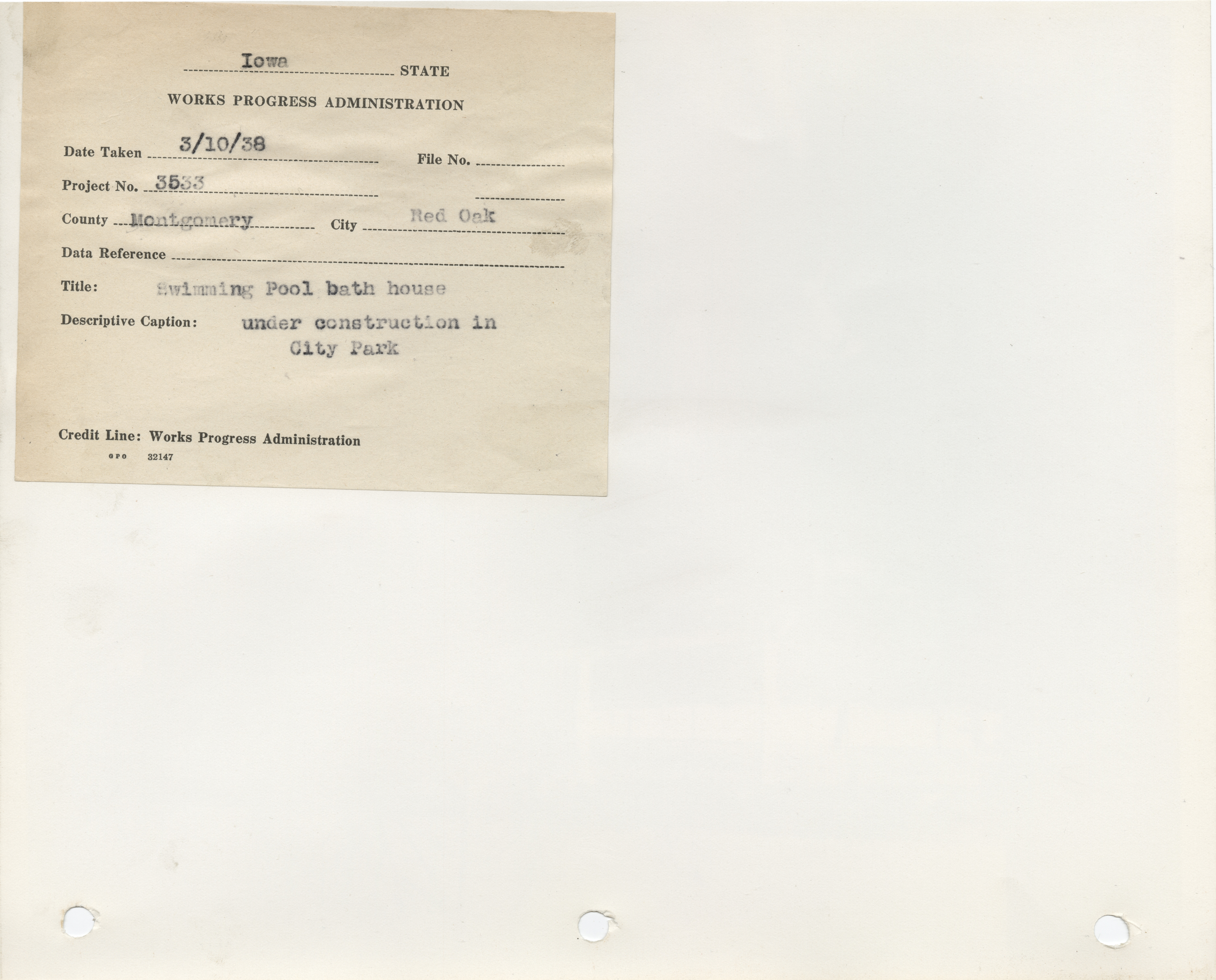 - "Photograph of the construction of swimming pool bathhouse in the Red Oak City Park", Work Projects Administration (Iowa) Photographs, Iowa State University Library Digital Collections