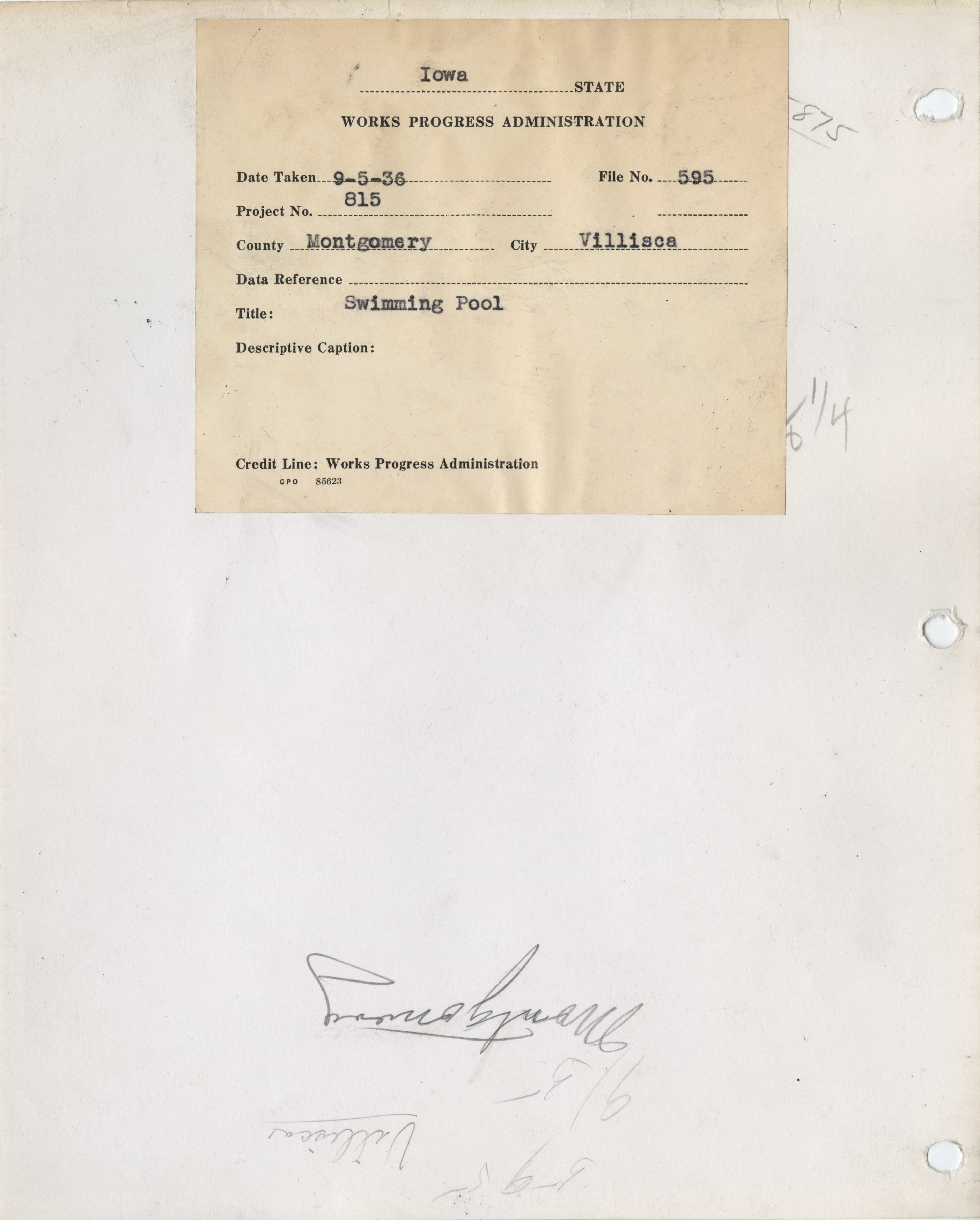 - District 5. Montgomery County. Villisca. Swimming Pool and Athletic Field. Project 815. (5 b/w photographs), 1936-1937