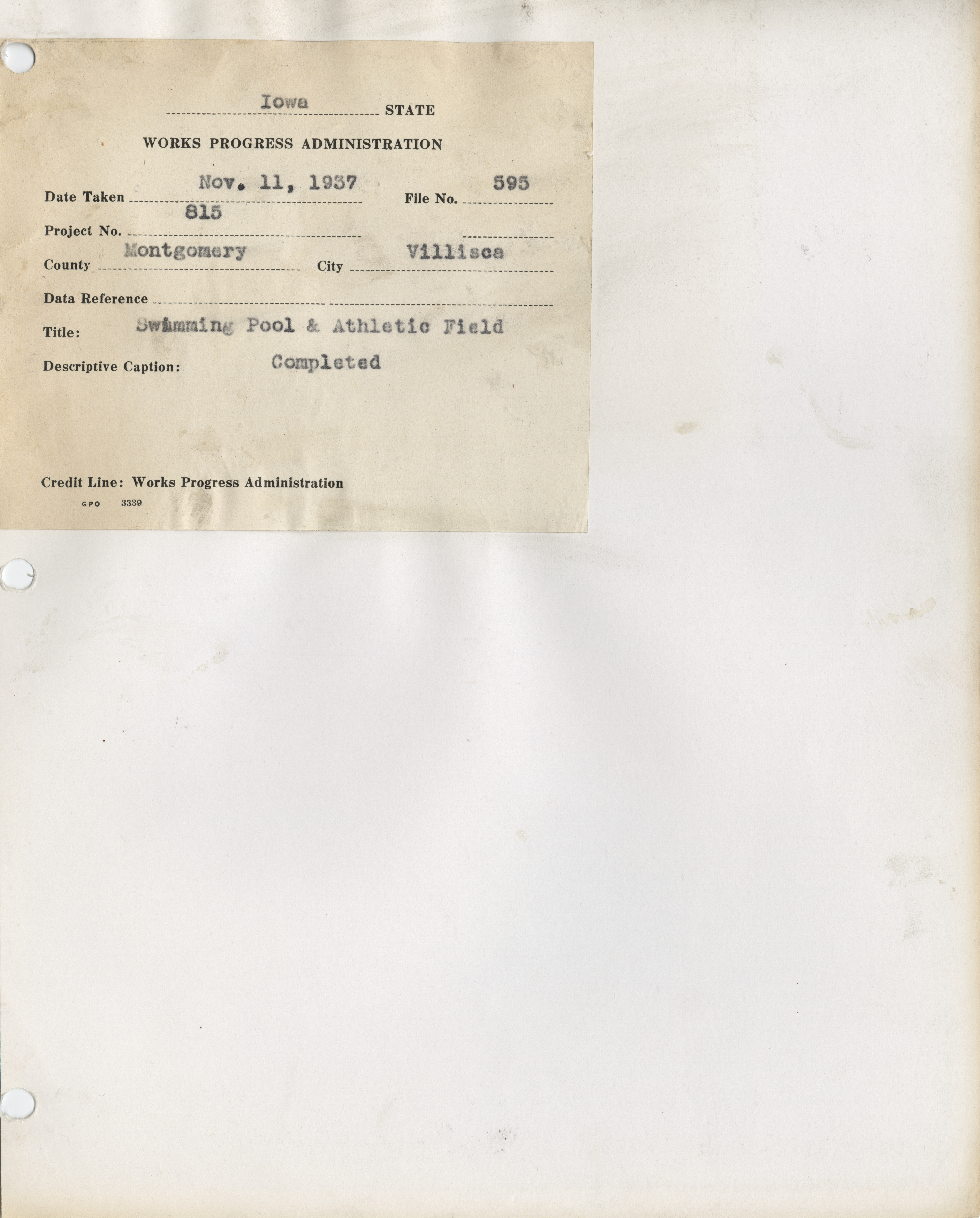 - District 5. Montgomery County. Villisca. Swimming Pool and Athletic Field. Project 815. (5 b/w photographs), 1936-1937