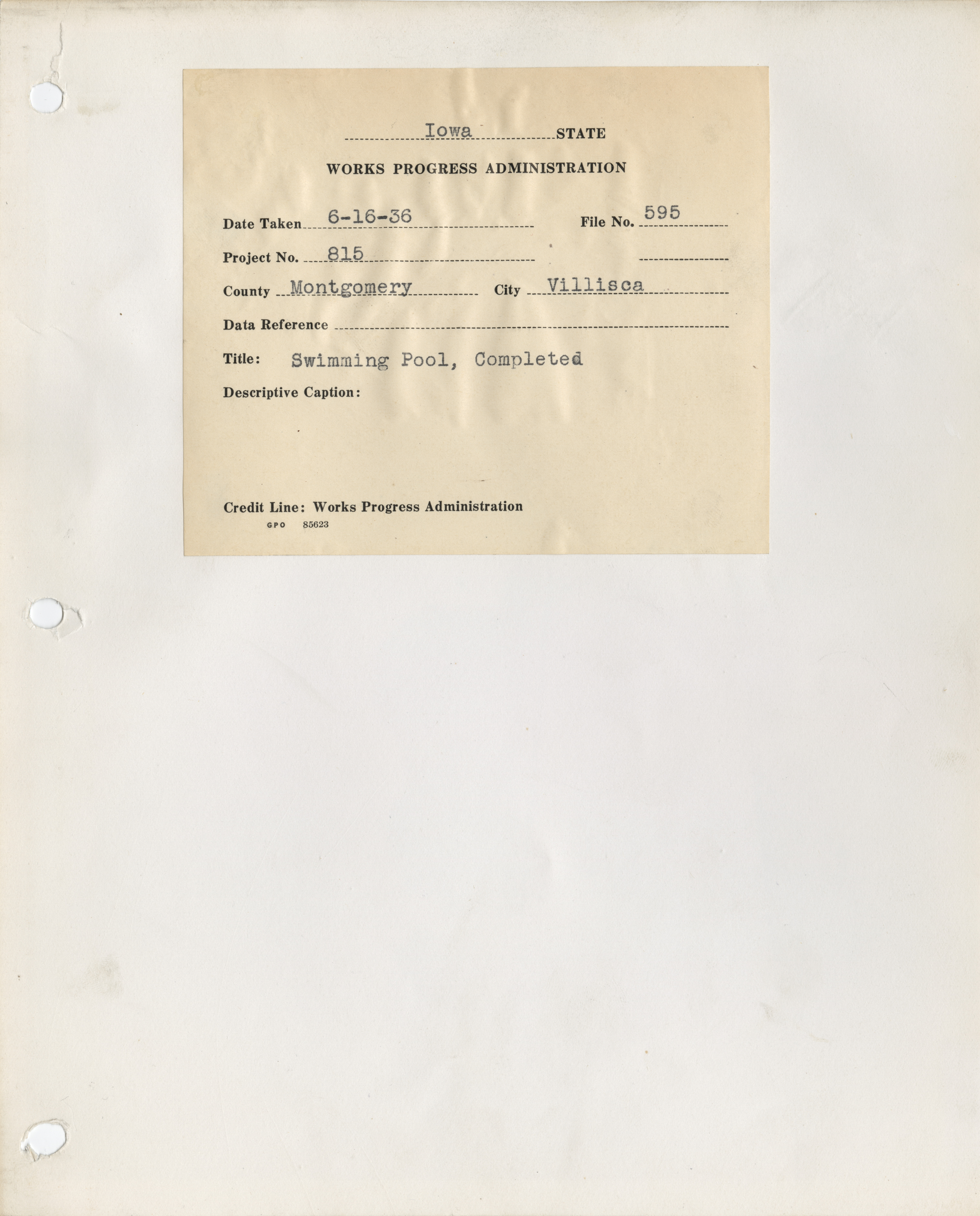 - "Photograph of the swimming pool in Villisca", Work Projects Administration (Iowa) Photographs, Iowa State University Library Digital Collections