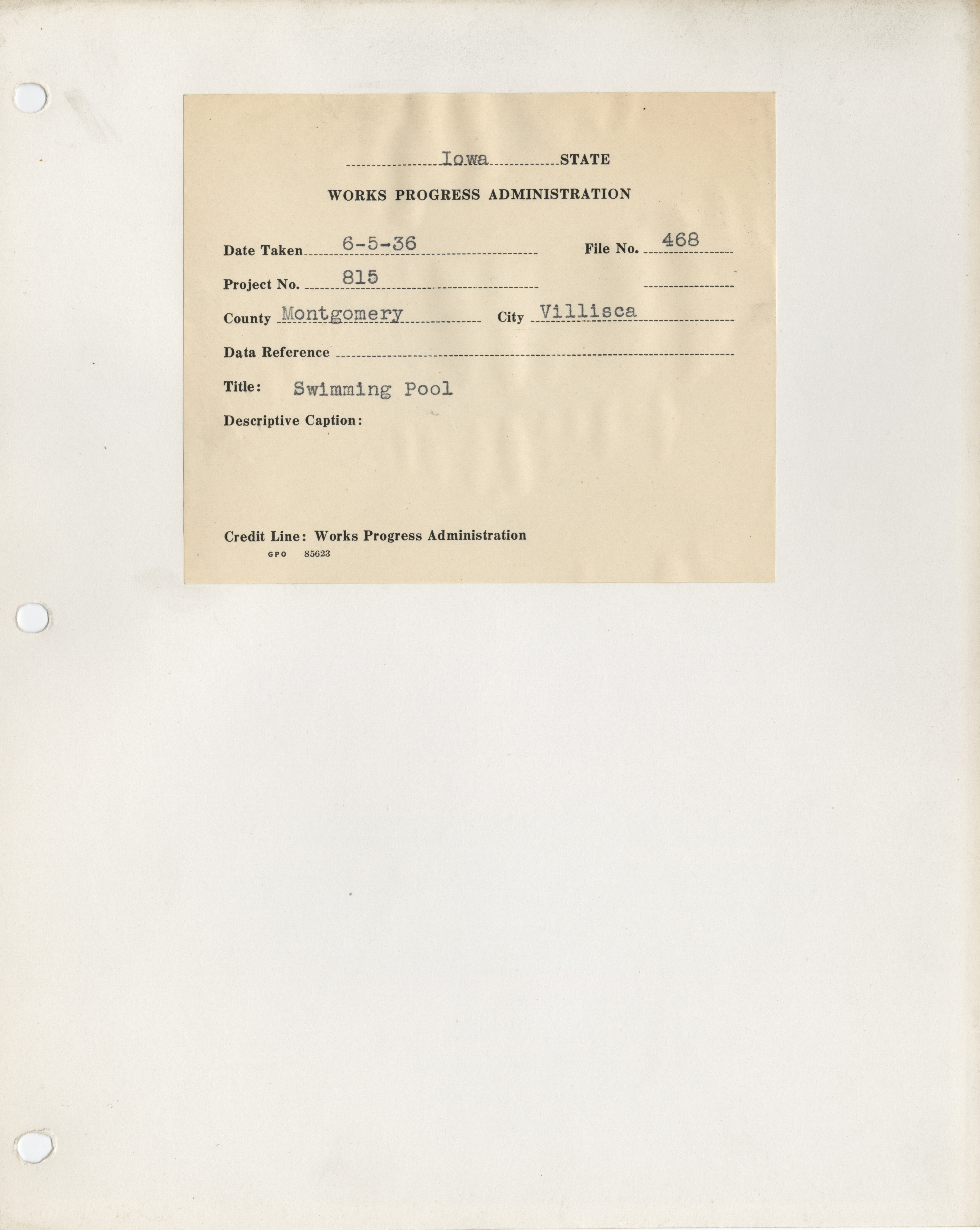- "Photograph of the construction of swimming pool in Villisca", Work Projects Administration (Iowa) Photographs, Iowa State University Library Digital Collections