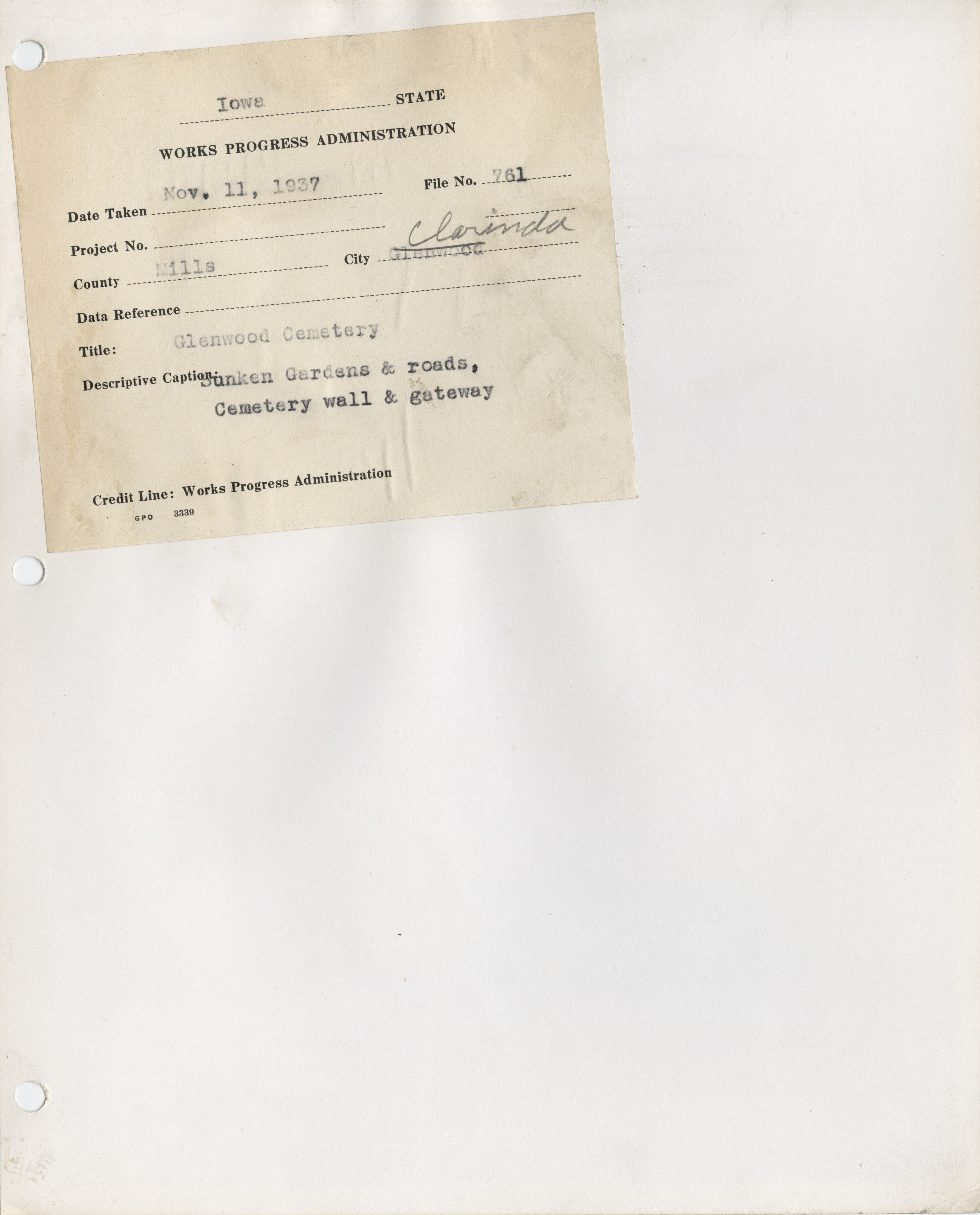- "Photograph of the entrance of the Glenwood Cemetery in Clarinda", Work Projects Administration (Iowa) Photographs, Iowa State University Library Digital Collections