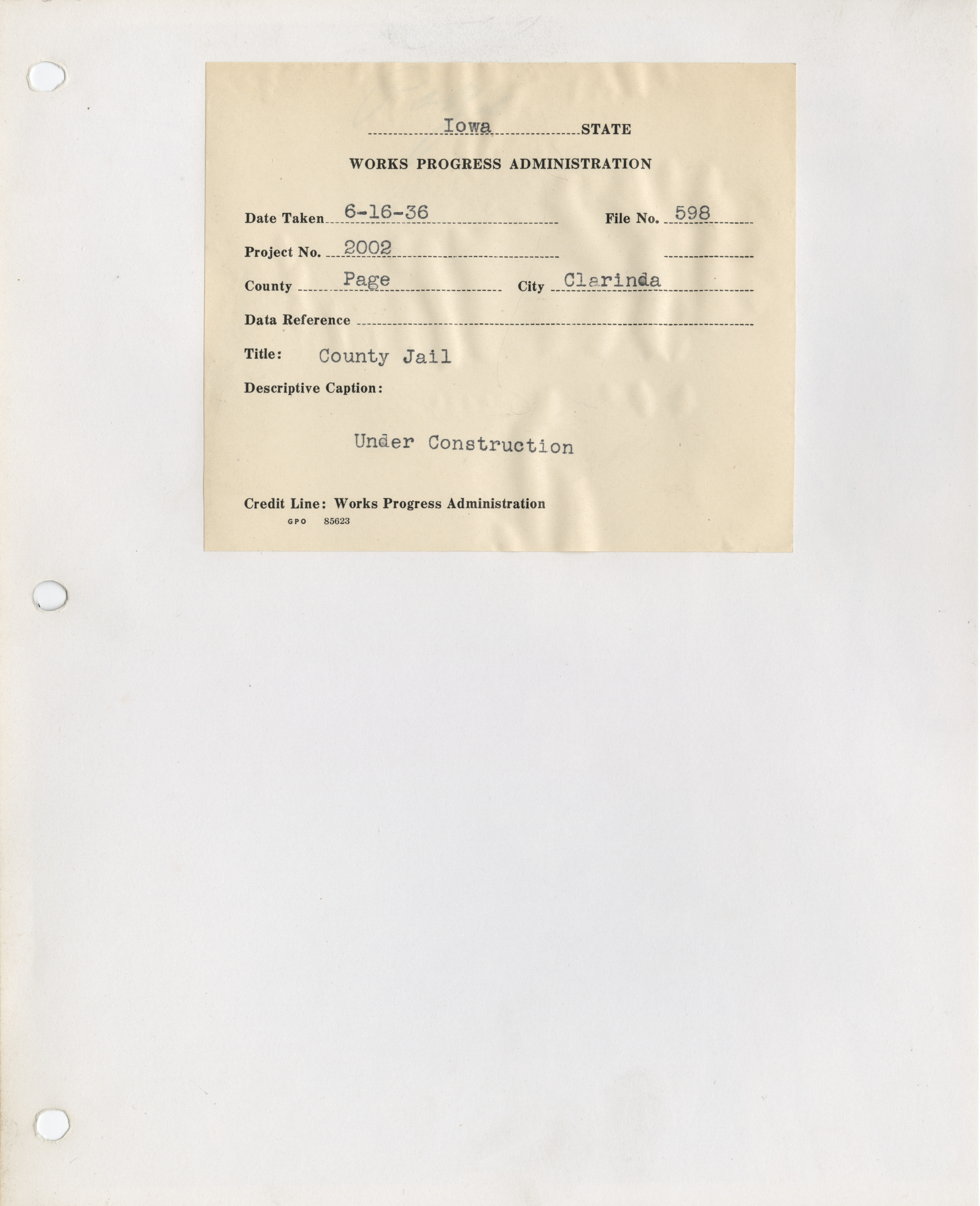 - "Photograph of the construction of Page County Jail in Clarinda", Work Projects Administration (Iowa) Photographs, Iowa State University Library Digital Collections
