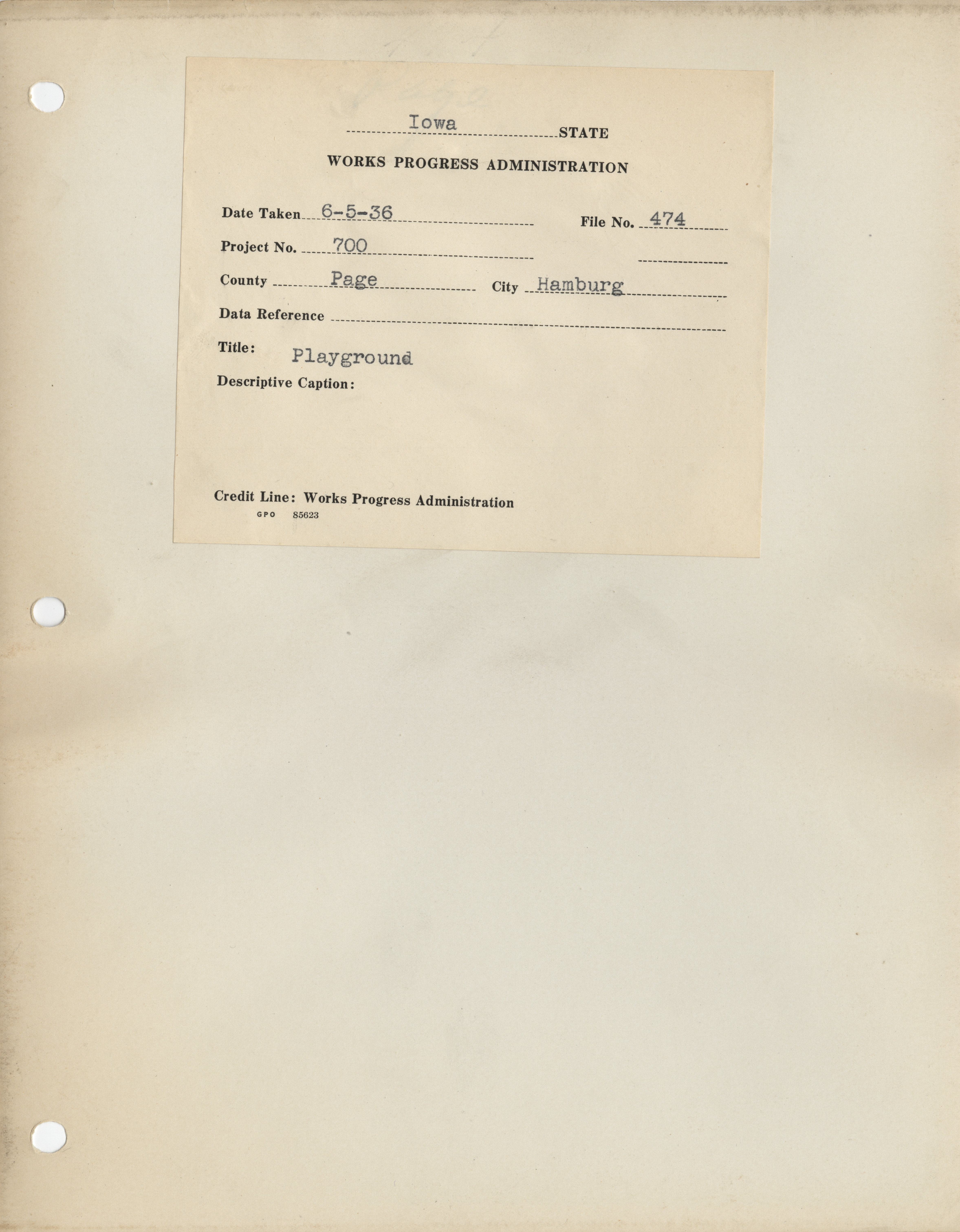 - District 5. Page County. Hamburg. Playground. Project 700. (1 b/w photograph), 1936