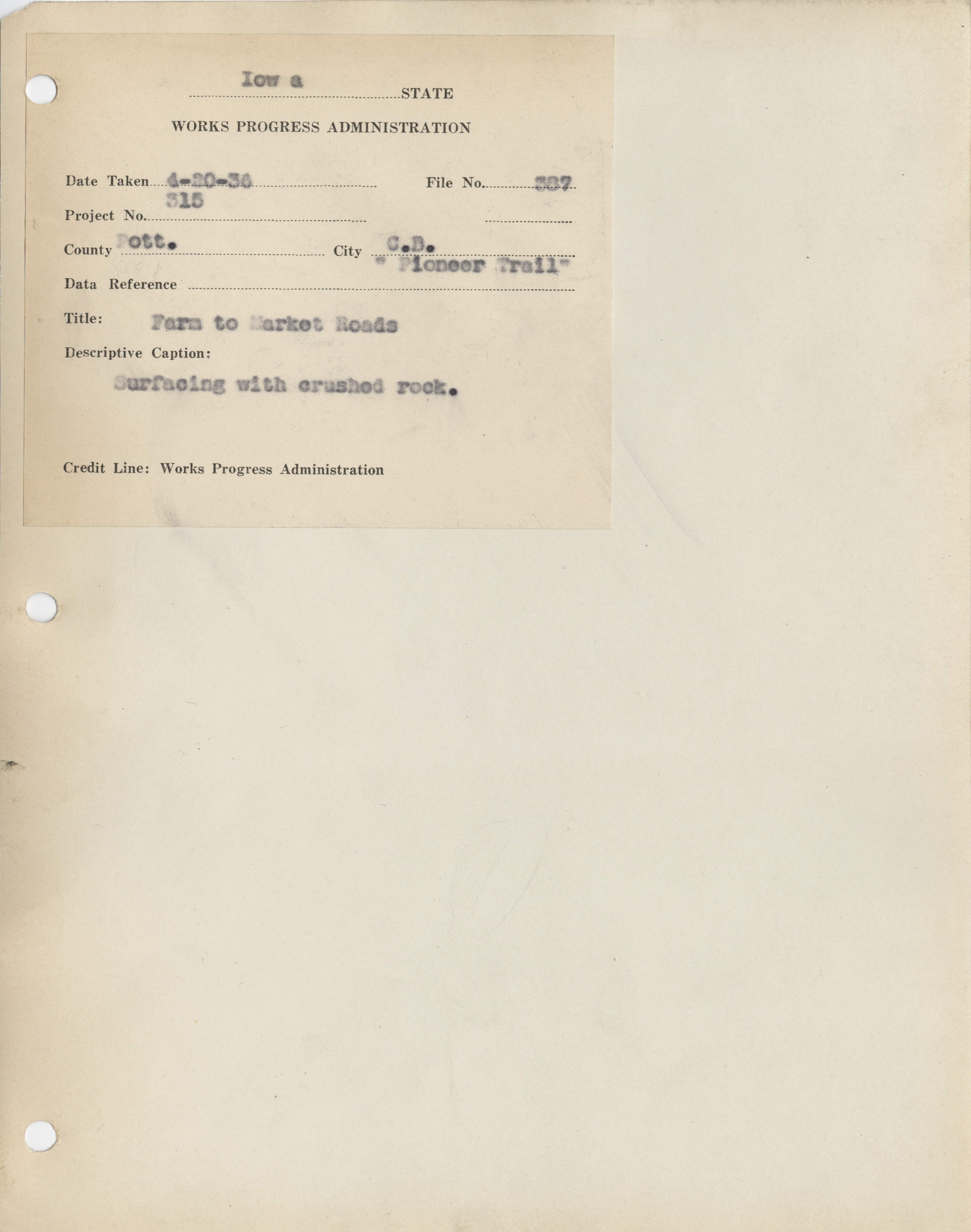 - "Photograph of farm-to-market road surfacing with crushed rock in Council Bluffs", Work Projects Administration (Iowa) Photographs, Iowa State University Library Digital Collections