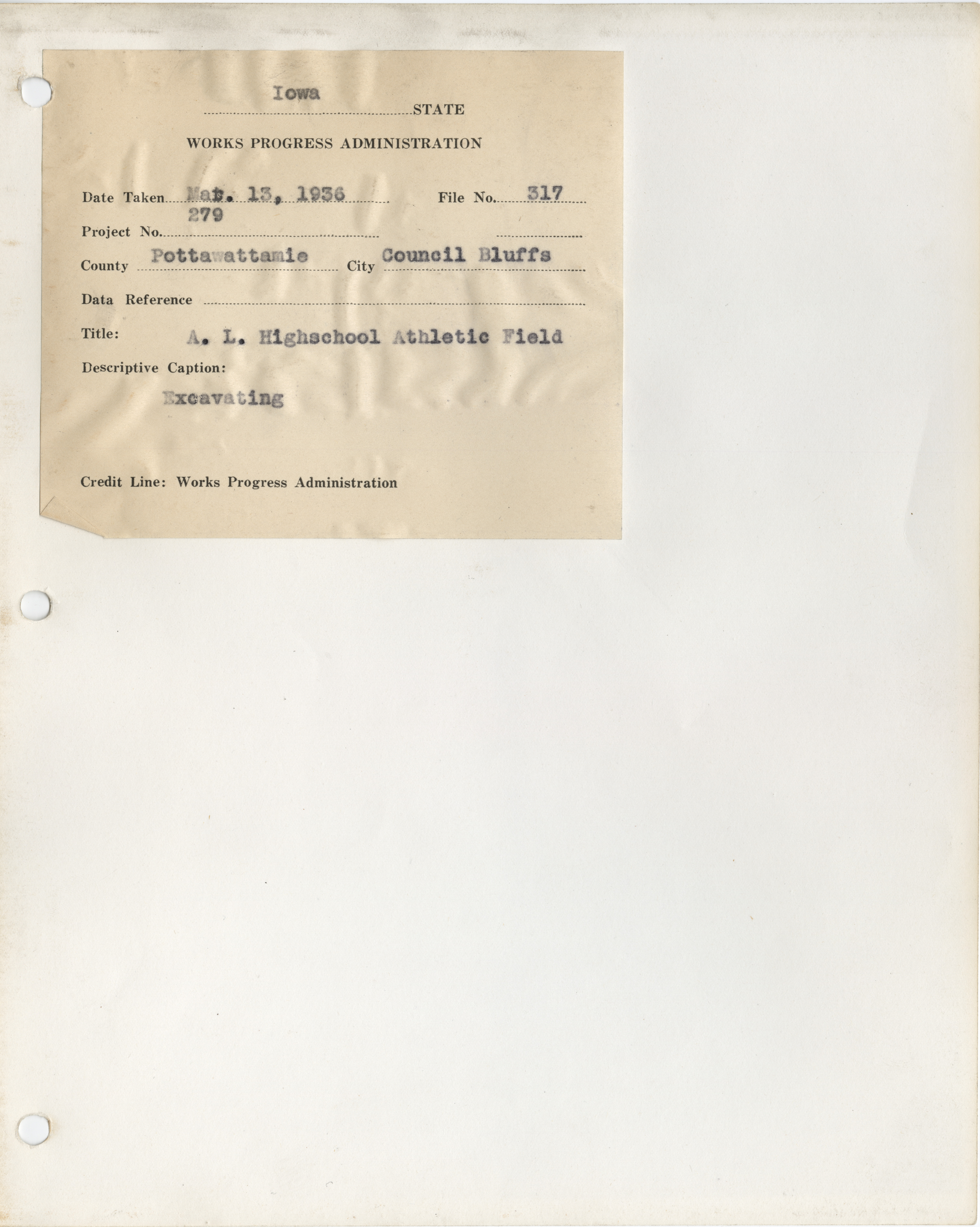 - District 5. Pottawattamie County. Council Bluffs. Athletic Field, Abraham Lincoln High School. Project 279. (5 b/w photographs), 1935-1937