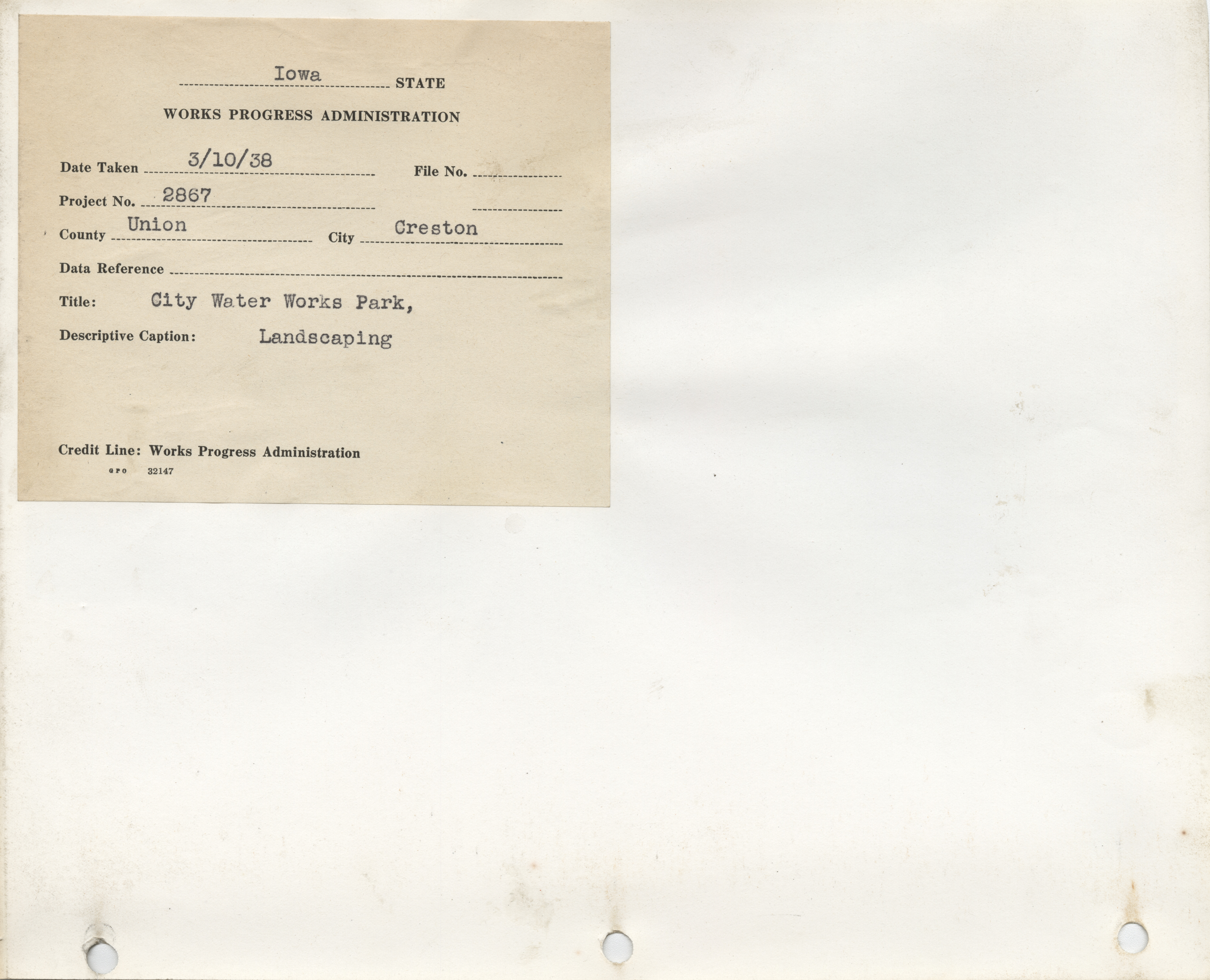 - District 4. Union County. Creston. Water Works Park Landscaping. Project 2867. (2 b/w photographs), 1938