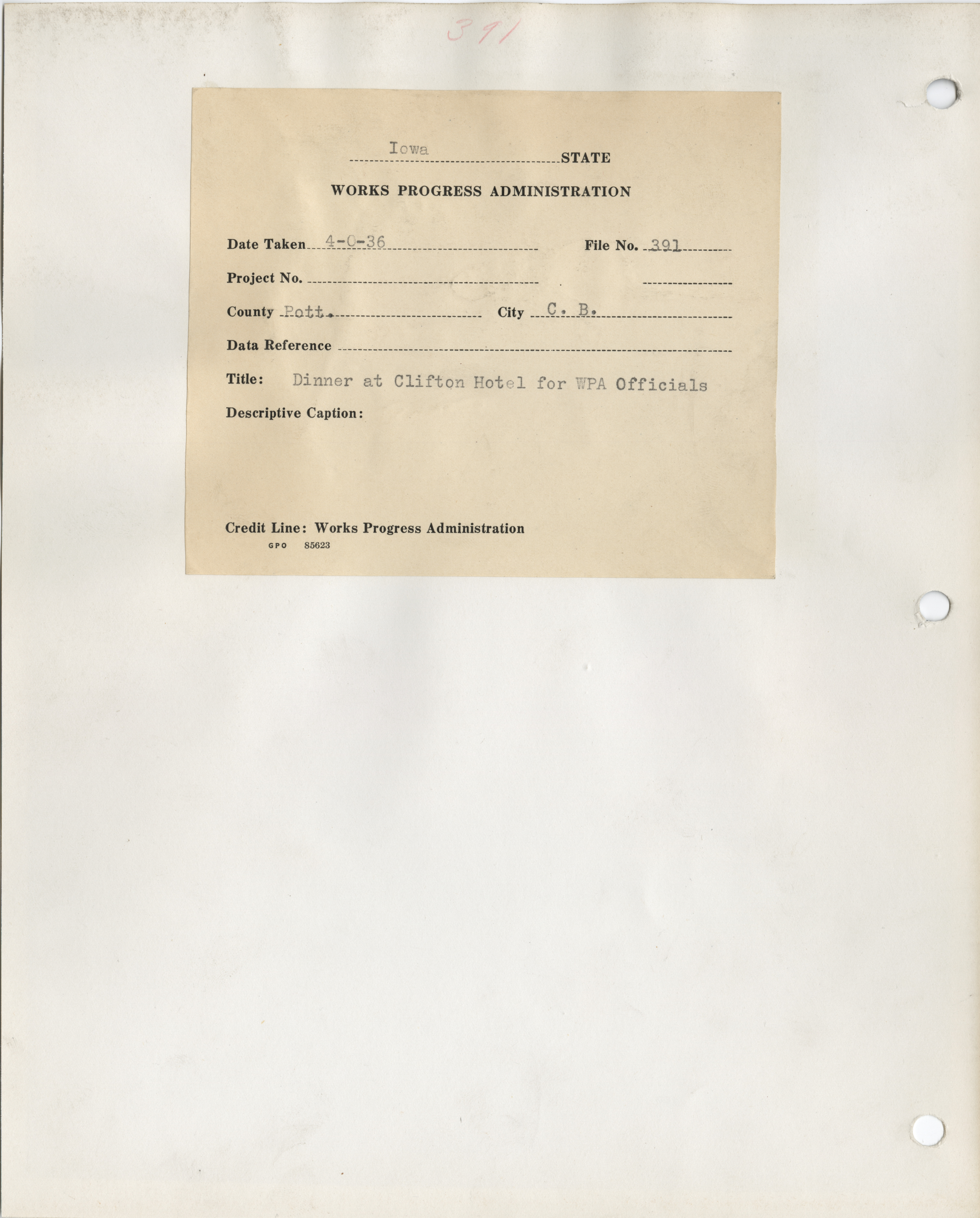 - "Photograph of the WPA Officials dinner at Clifton Hotel in Council Bluffs", Work Projects Administration (Iowa) Photographs, Iowa State University Library Digital Collections