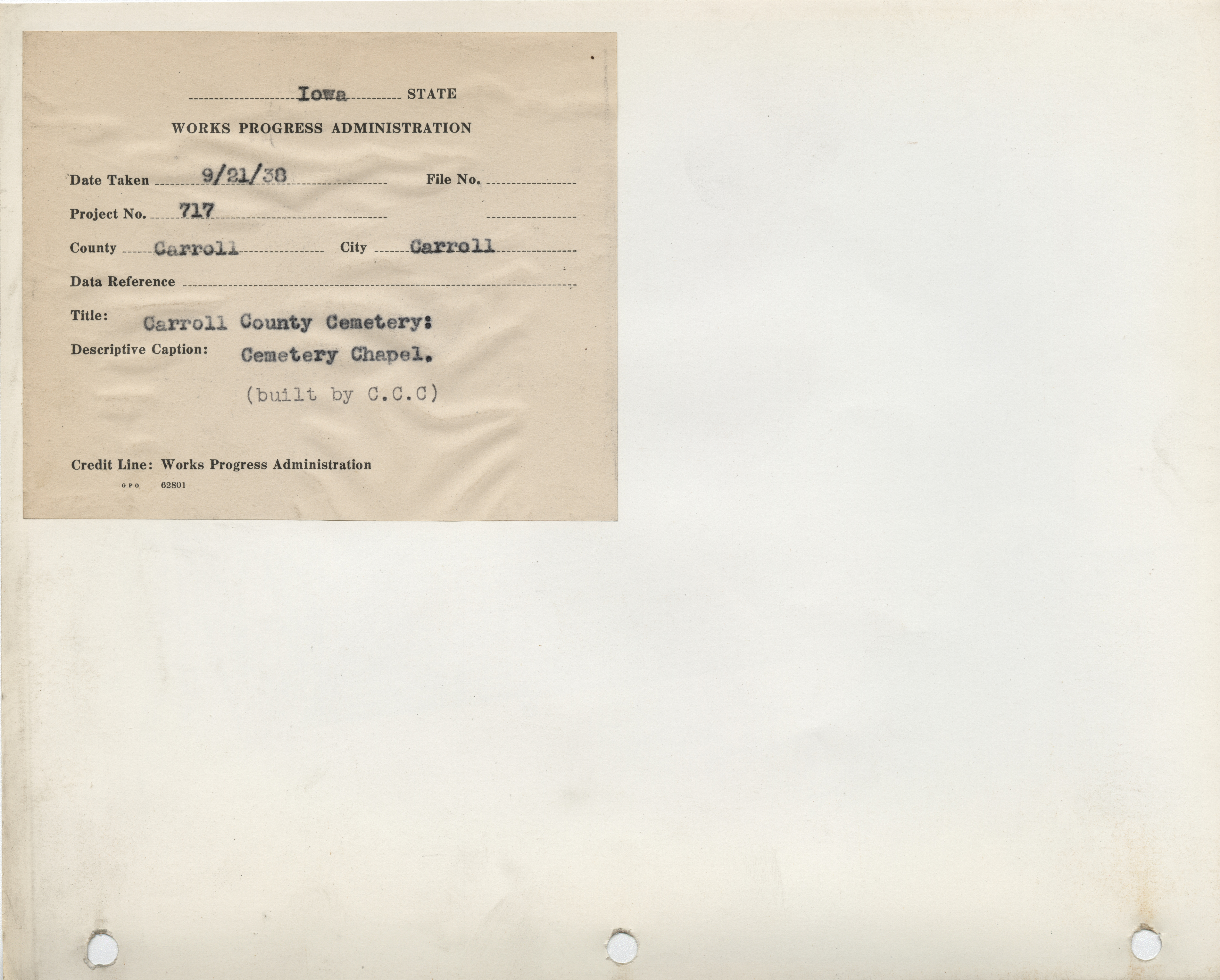 - "Photograph of the chapel in the Carroll County Cemetery", Work Projects Administration (Iowa) Photographs, Iowa State University Library Digital Collections
